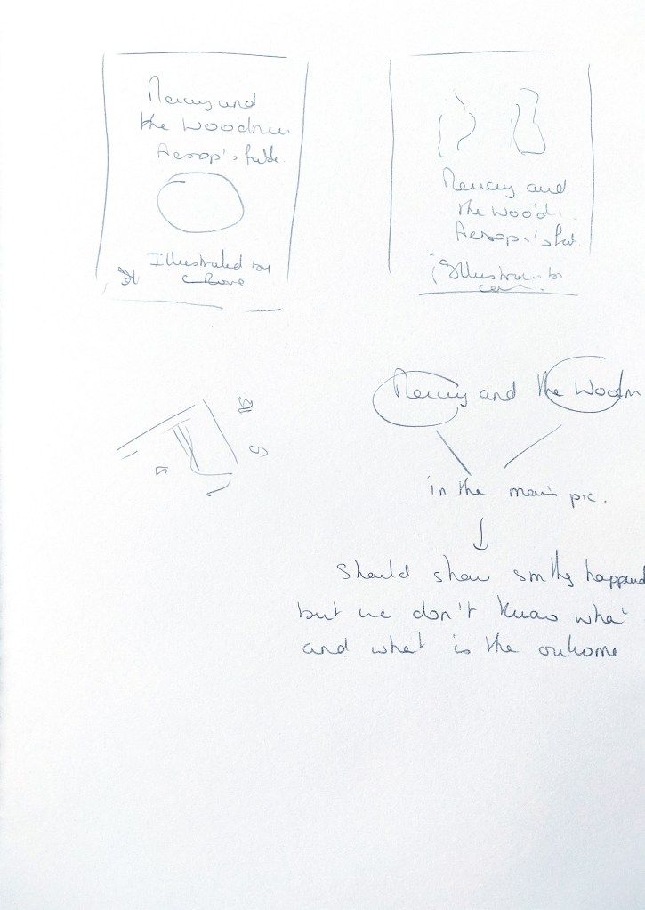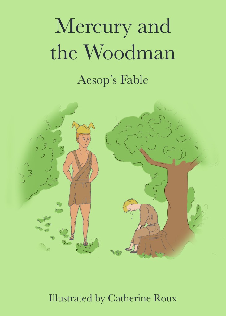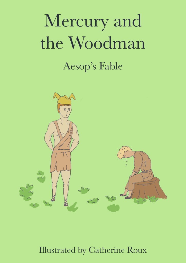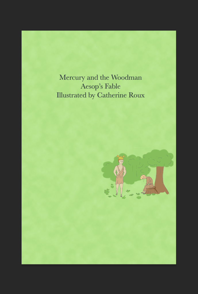 I did not want the cover page to be too busy and liked the idea of the two characters standing out at the centre of the page. Their encounter illustrates the heading (Mercury and the Woodman) and indicates that something has just happened as the woodman is distressed; yet it does not reveal anything about the story.