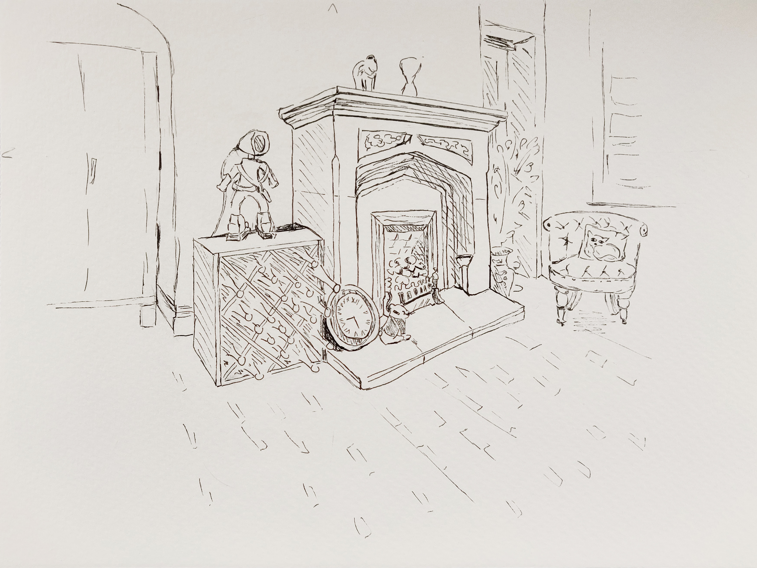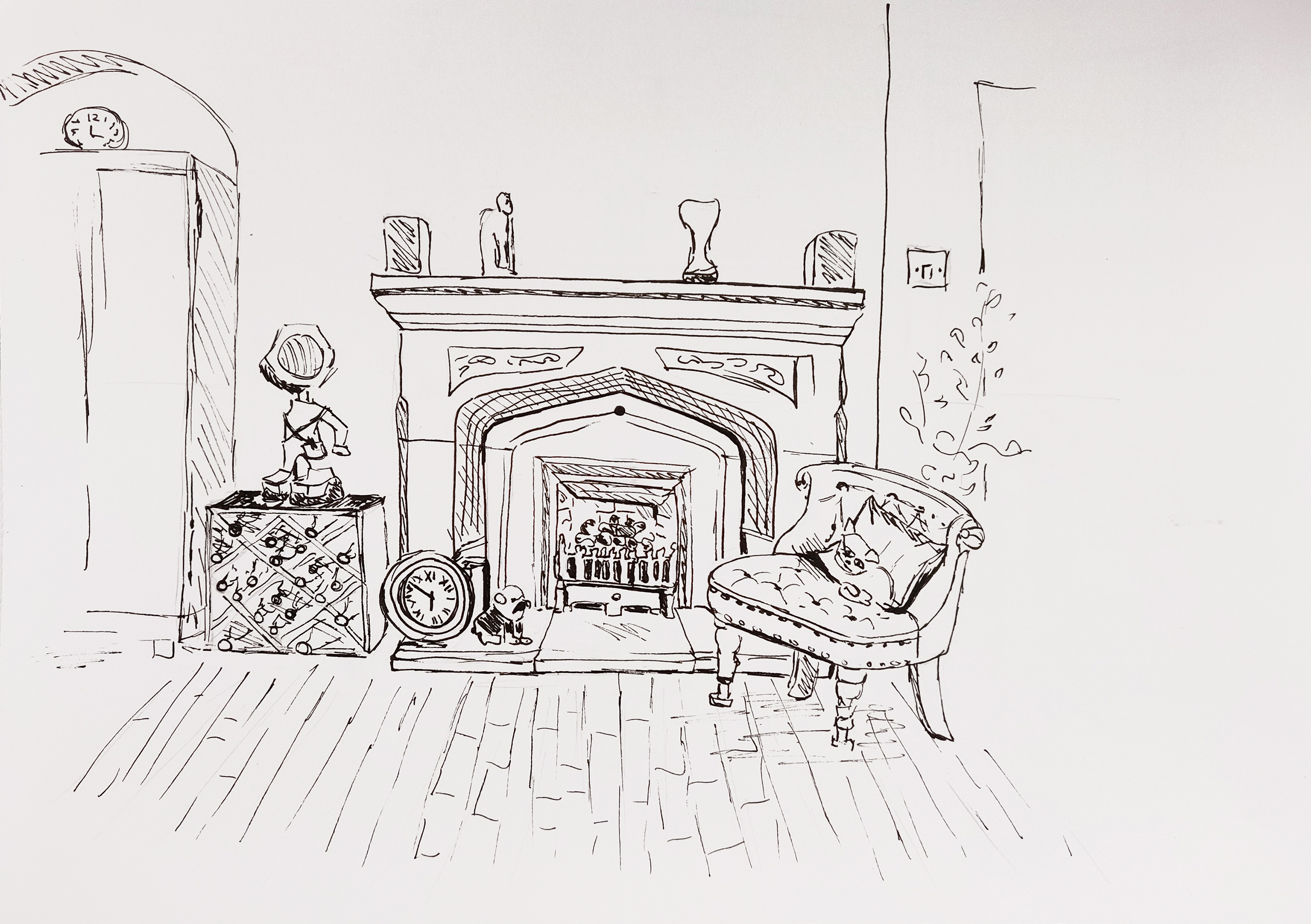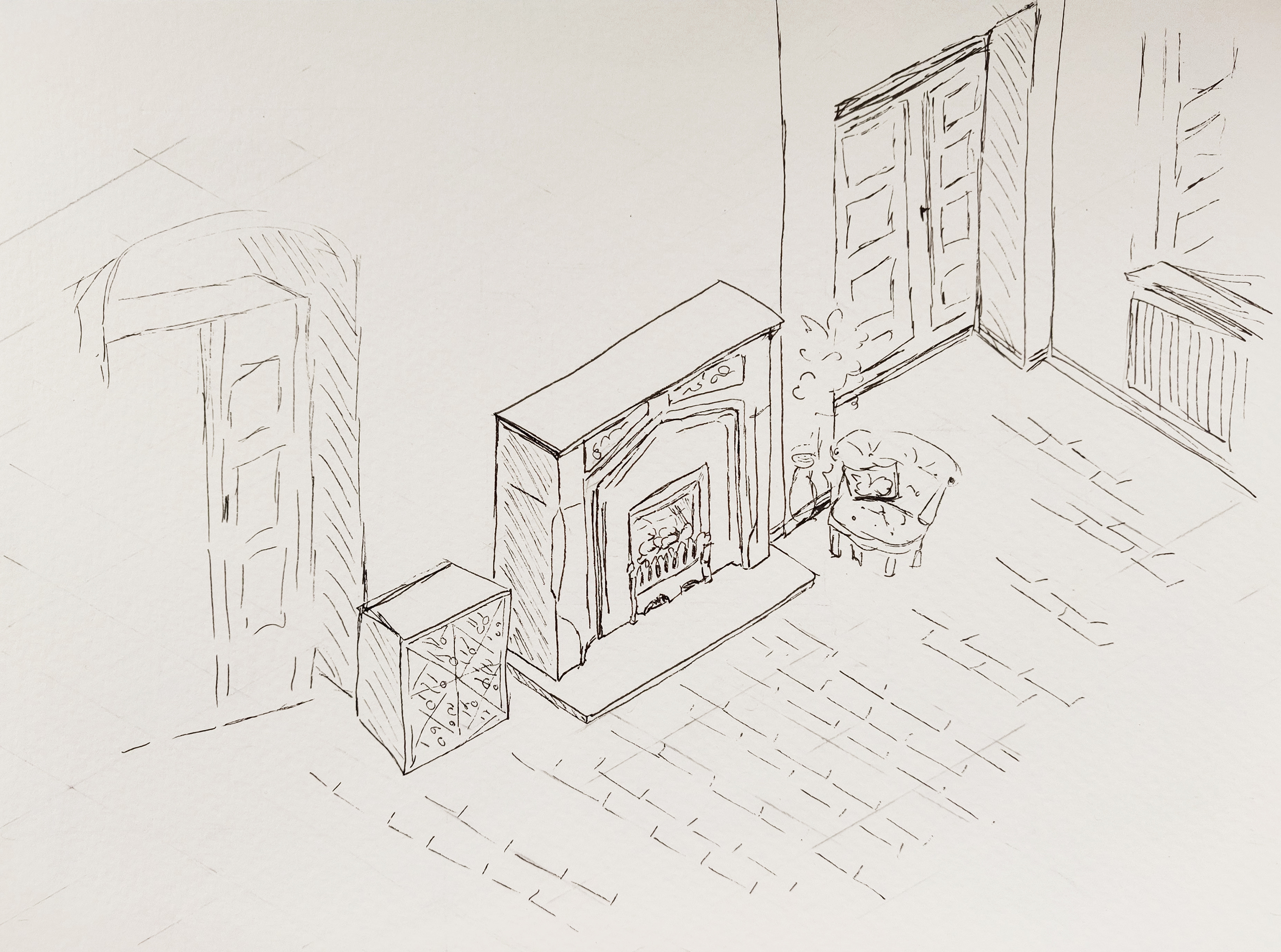 I chose the fireplace and its surroundings in our home. It meant that I would have enough space to draw this area from different angles and viewpoints.