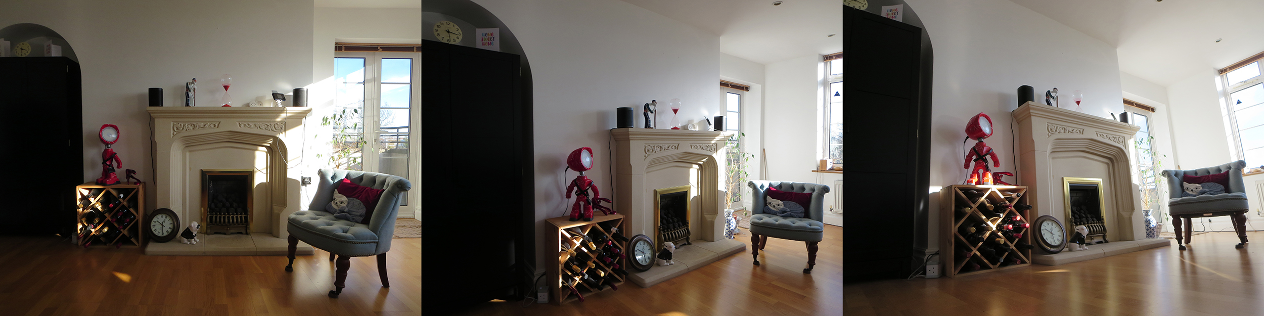 I struggled to find a viewpoint that would be suitable for a three-point perspective and I am not sure that I succeeded. I tried to be in a position where I would see the fireplace from below but there is not enough contrast in size between the bottom and the top of the fireplace to fully show the perspective. It is not obvious that there would be a vanishing point above the fireplace (as would be the case from the bottom of a building for instance).