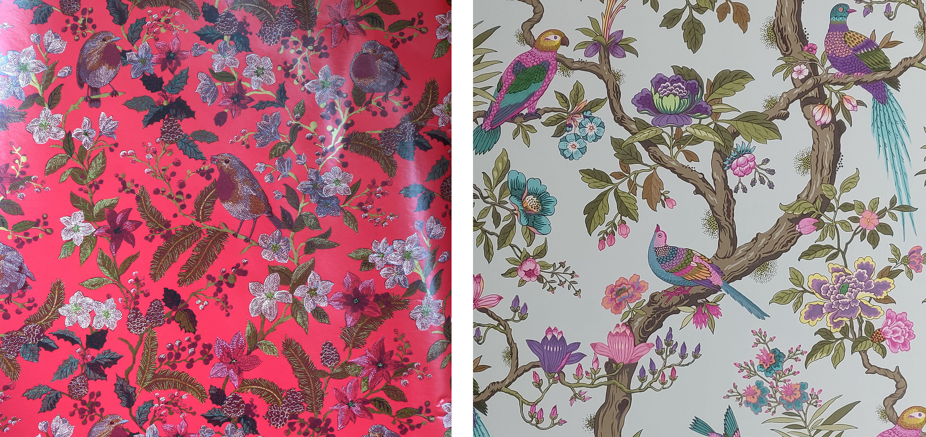 Illustrators are often very creative with colours when creating designs for wallpaper or fabrics and again the general aesthetic is more important than realism. The sample of wallpaper I photographed in Bruges is a good example. The colours are unrealistic as well as the flowers and birds. In fact, completely different types of flowers grow from the same branch. However, a lot is borrowed from reality. The position and proportion of the birds and the way the flowers grow from the branches. Maybe it is this combination of realism and fantasy that makes it work.