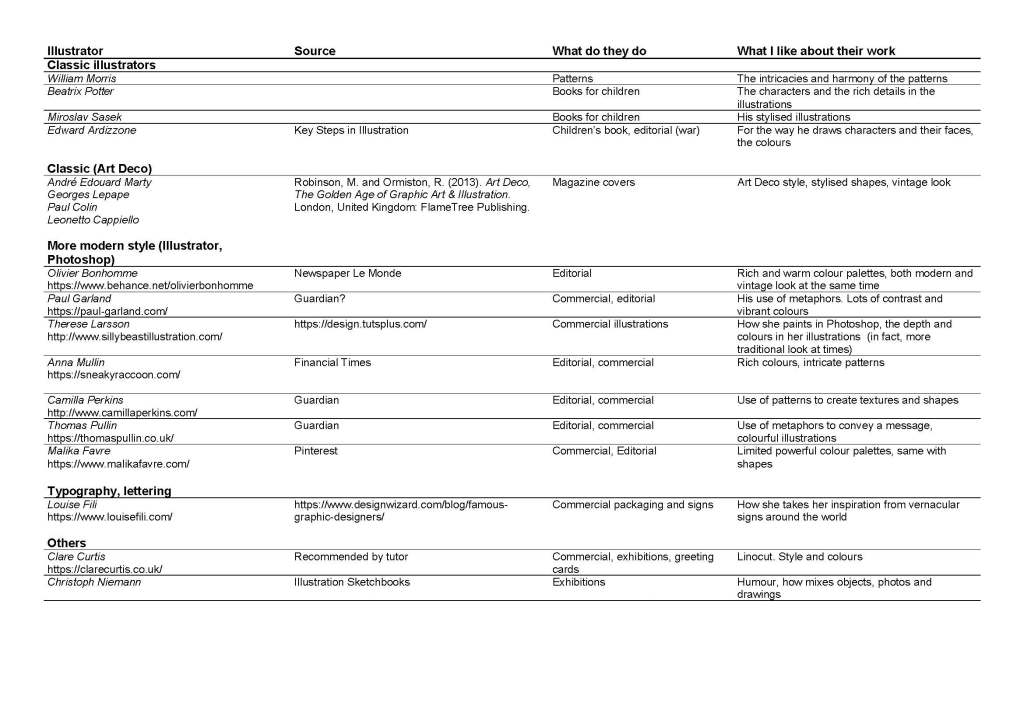 I created a table with some of my favourite illustrators containing the following information: their name, where I heard about them the first time, what they do (e.g. commercial illustrations, children’s books, etc.) and what I like about their work in a few words.