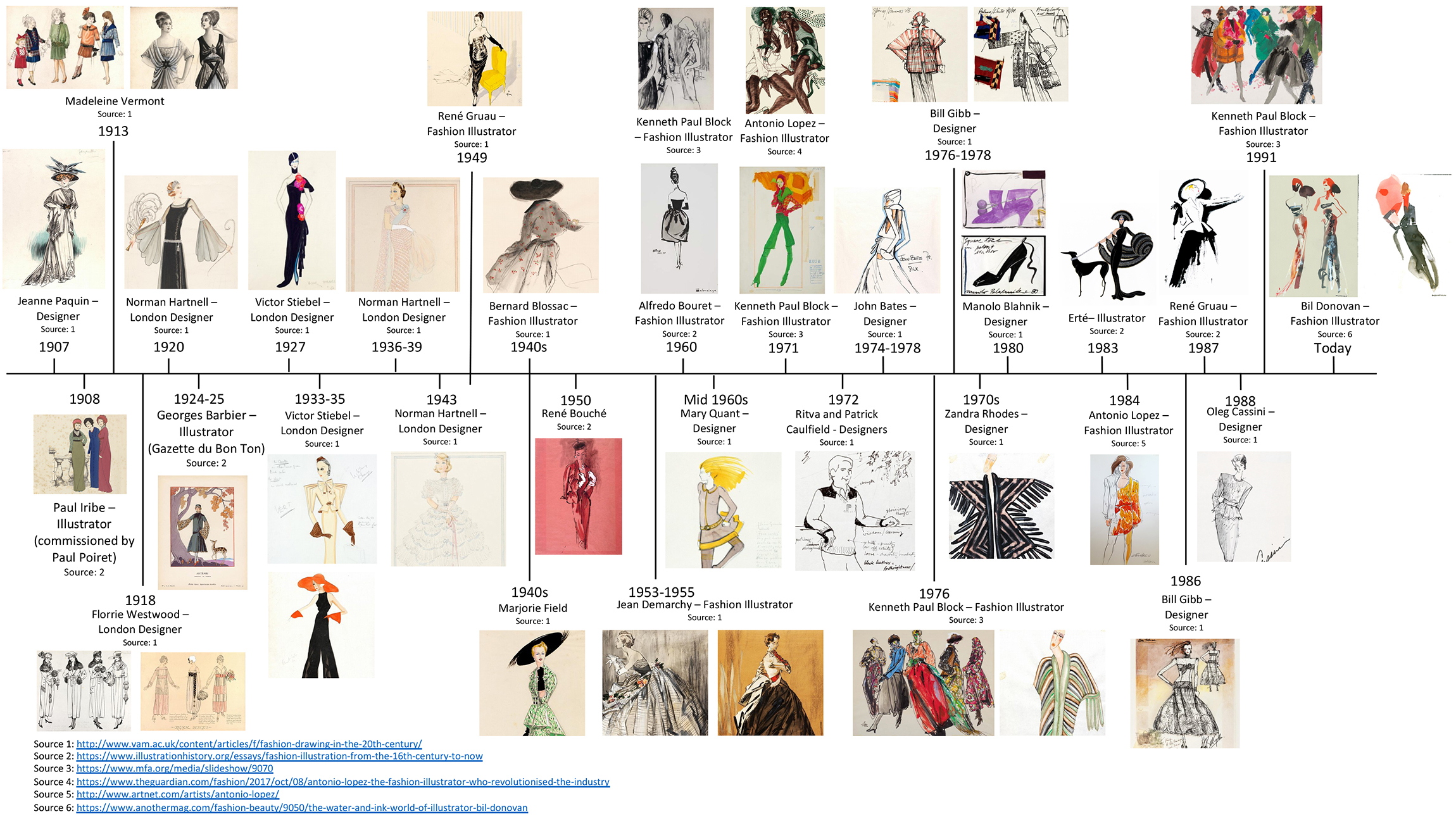 When I started doing some research about fashion illustrations, I found it difficult to see the evolution across the decades clearly although I discovered some interesting articles on the subject (see sources below timeline).