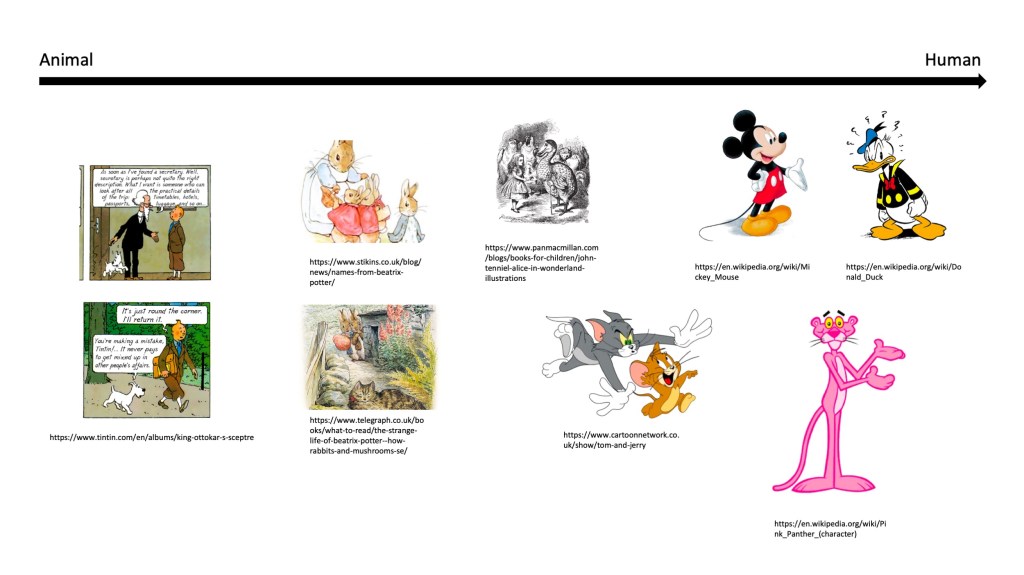 I created a gallery and tried to classify the characters depending on the degree of anthropomorphism. On the right, characters such as Mickey Mouse or Pink Panther have the same body structure as a human being whereas Snowy in Tintin looks and behaves like a dog.