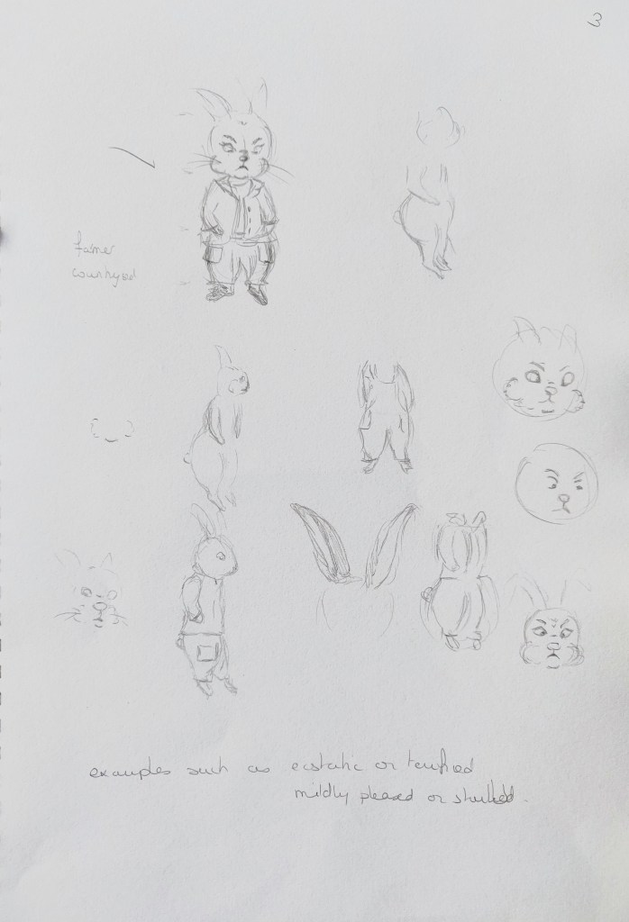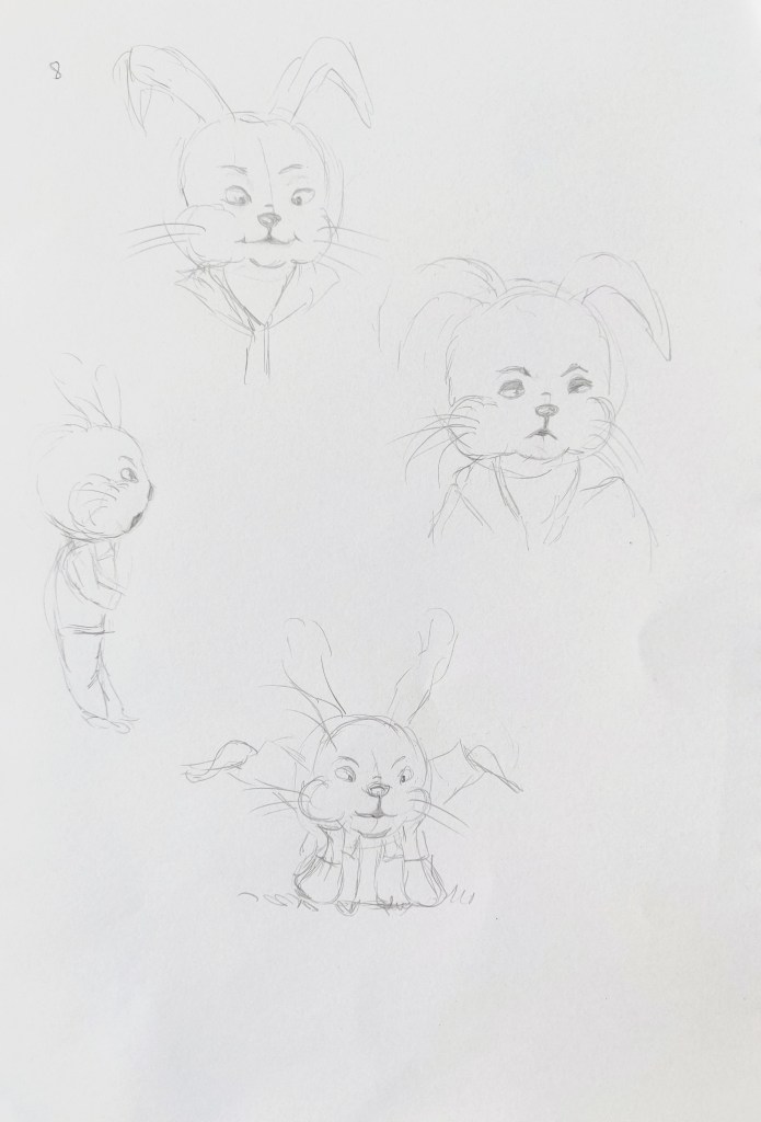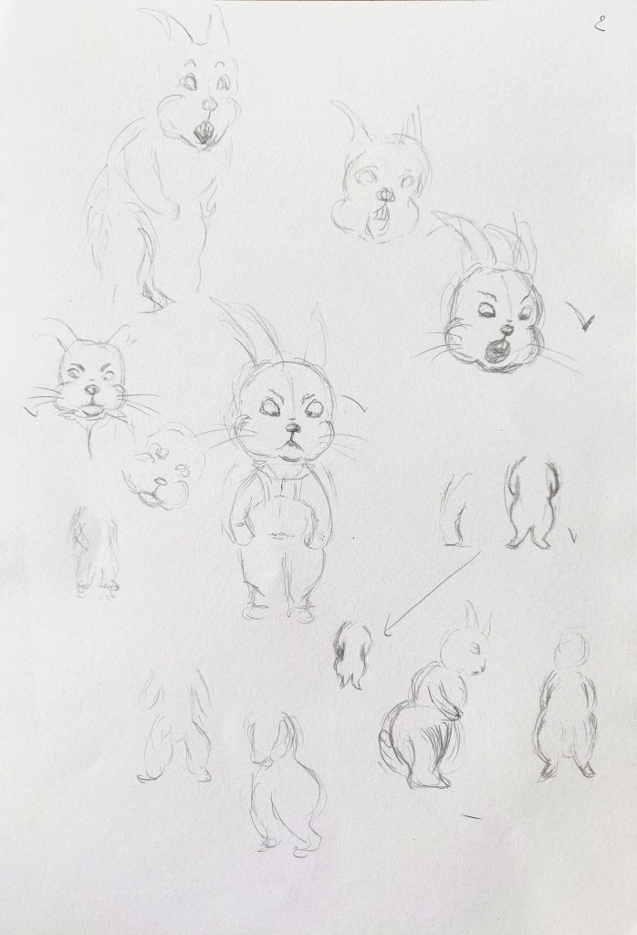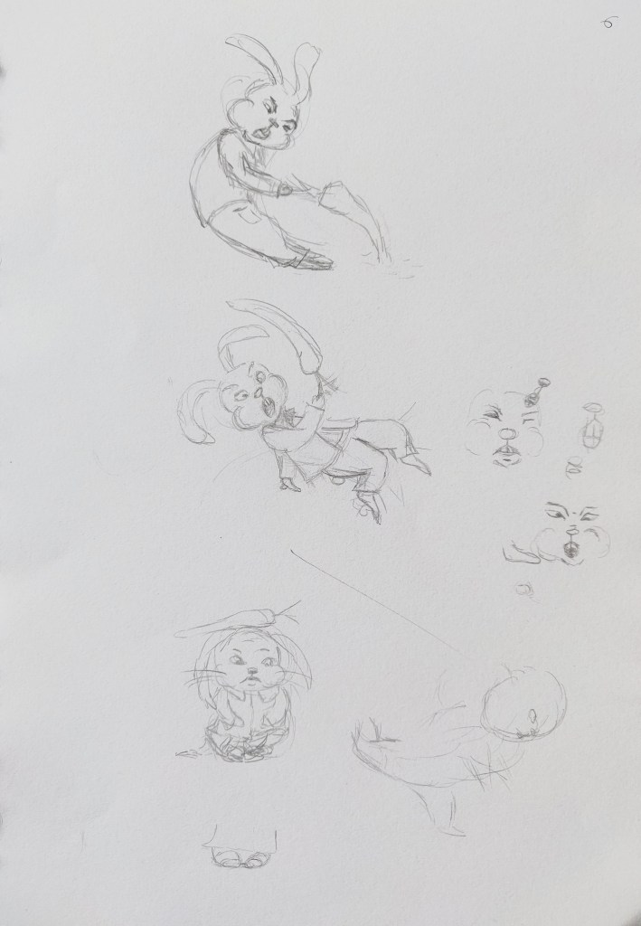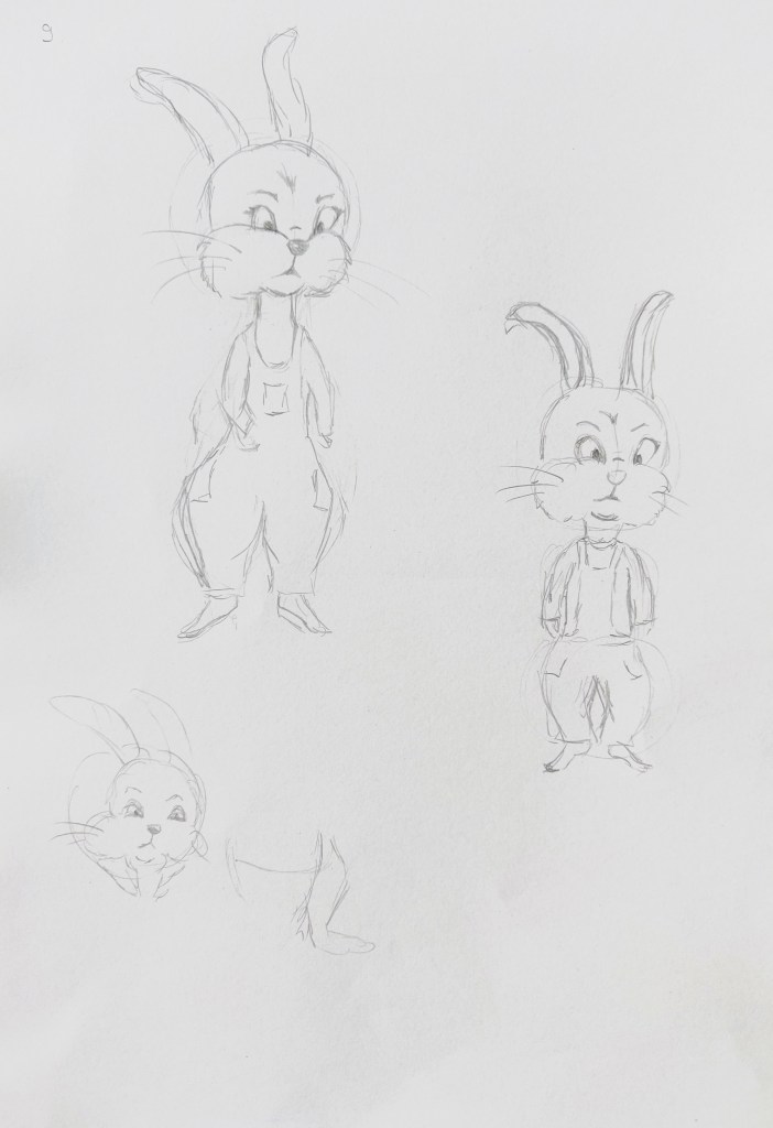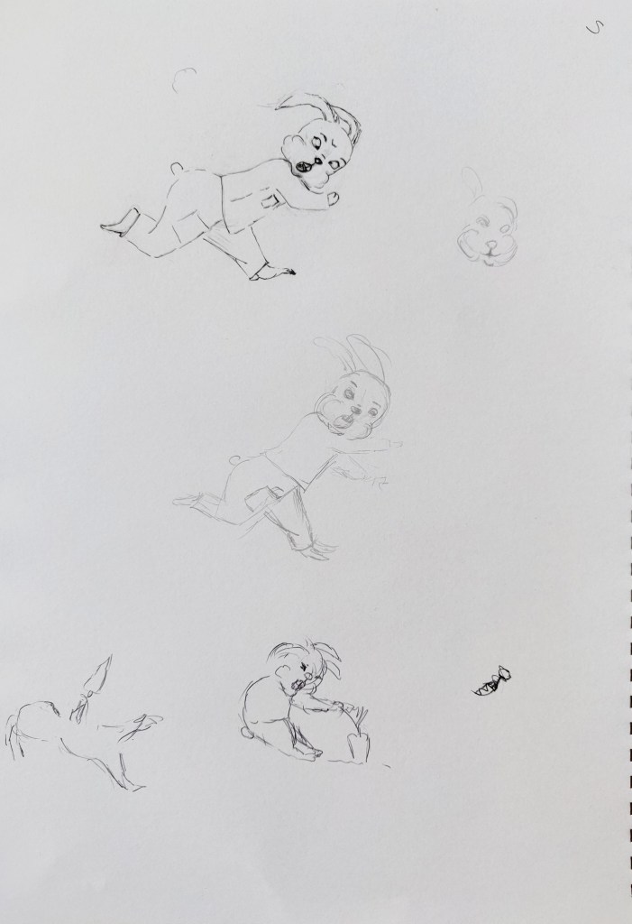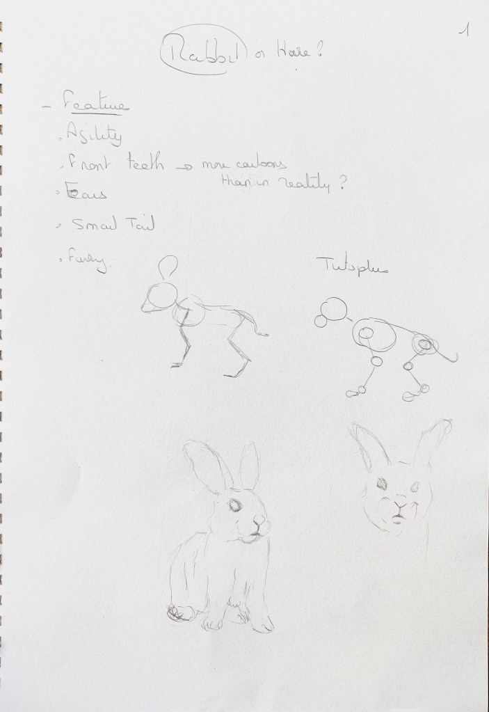 I used my sketchbook to explore further how to illustrate my character. I identified the main features of rabbits that enable us to recognise the animal even when traits are distorted and exaggerated: The ears, the front teeth, the strong back legs, the tail,…