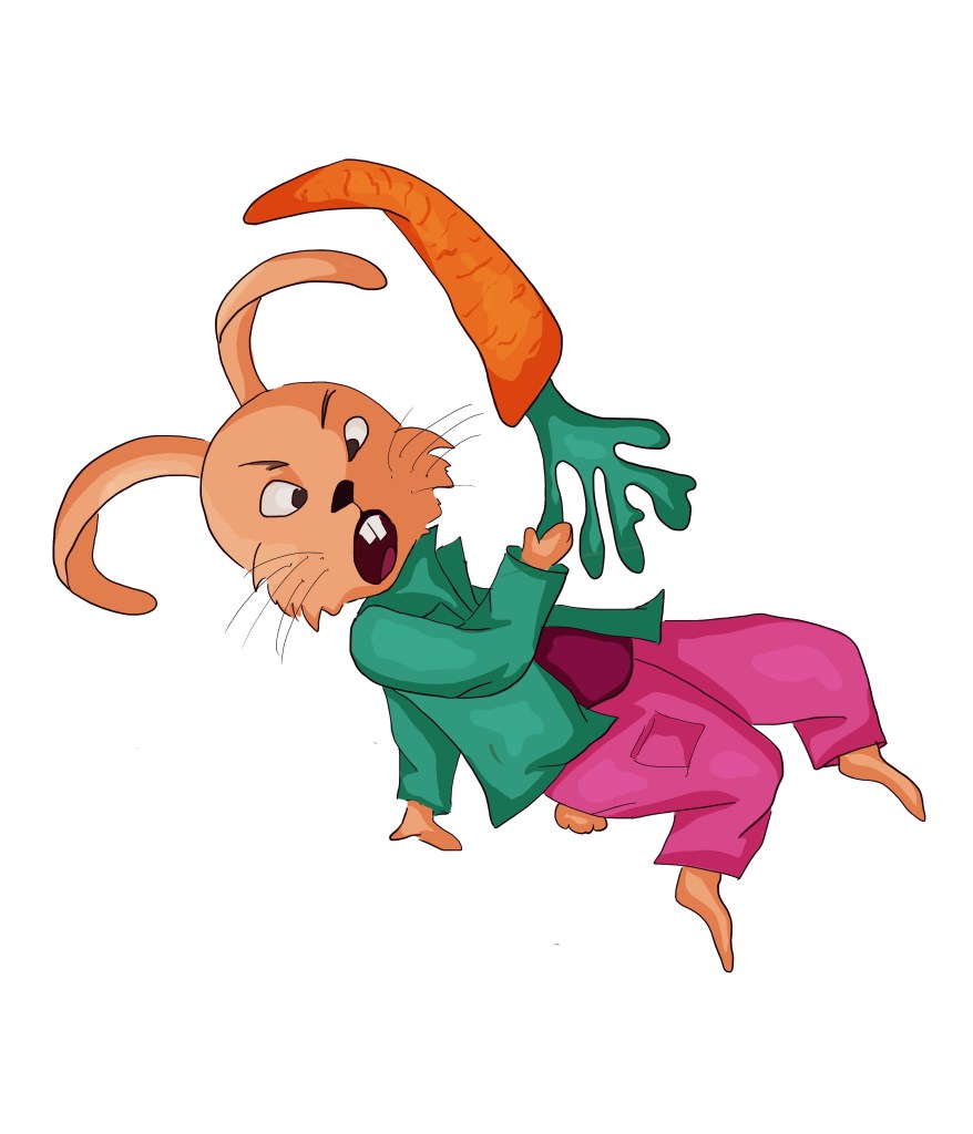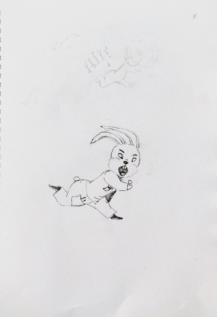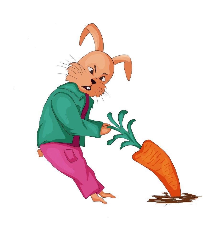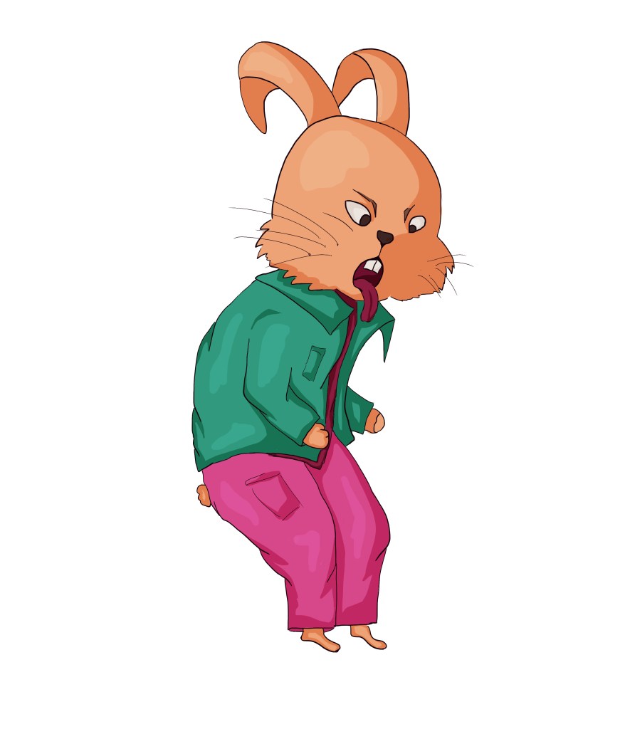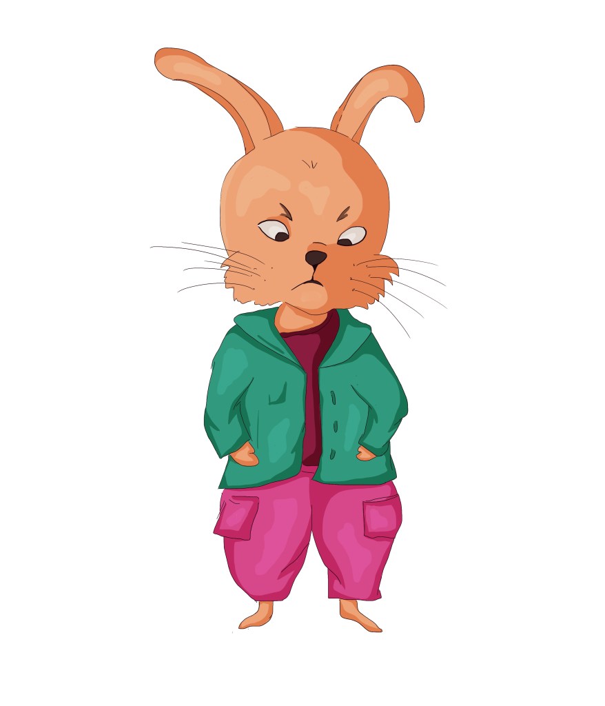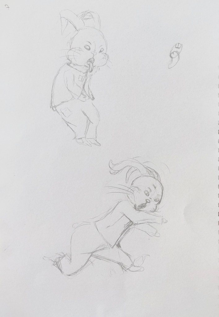 I used my sketchbook to explore further how to illustrate my character. I identified the main features of rabbits that enable us to recognise the animal even when traits are distorted and exaggerated: The ears, the front teeth, the strong back legs, the tail,…