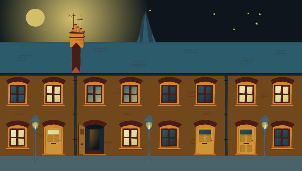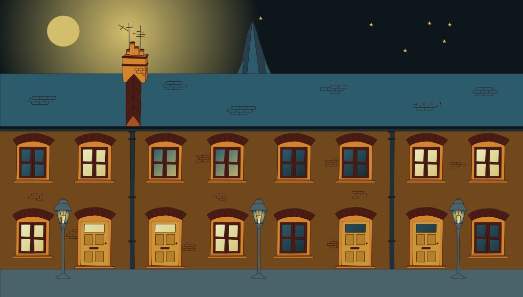 I selected a simple colour palette. The story would happen at night and the idea was to combine some bluish greys with orangey browns. I also needed a light yellow for light sources.