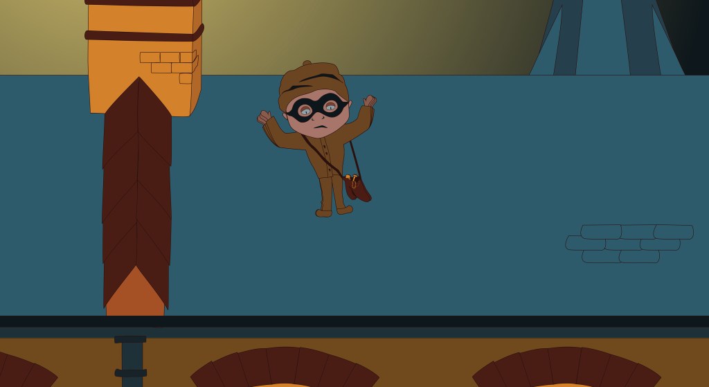 - The thief is on the roof. He thinks he is on his own; he intends to run away with some stolen goods. The hero is hiding behind a chimney.
