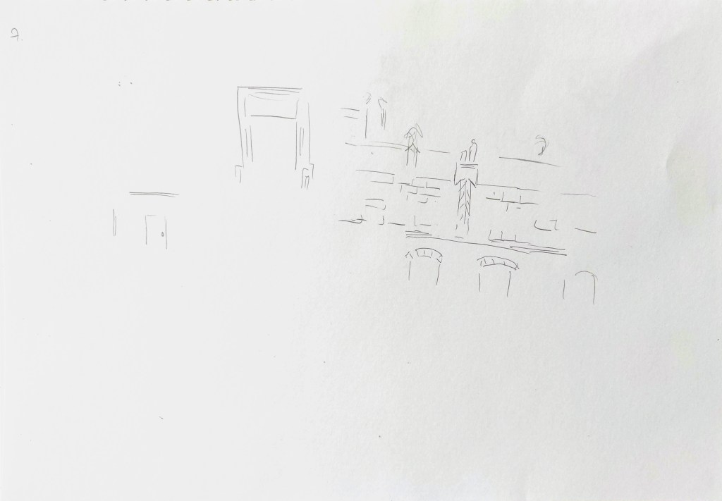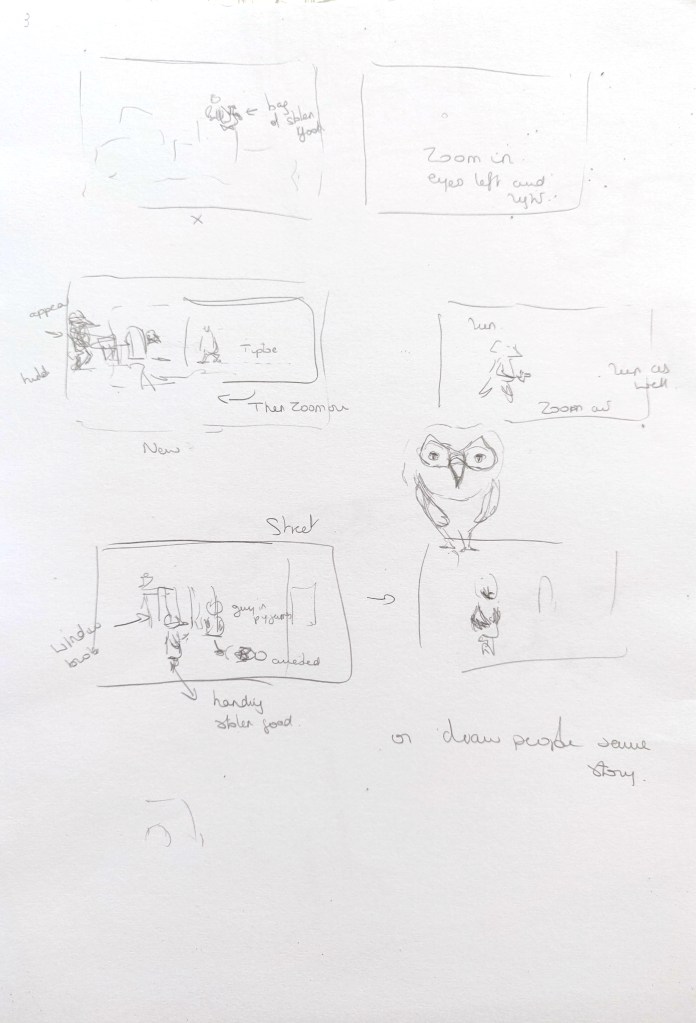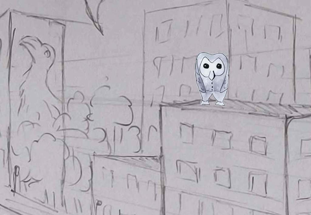 This part of the process was quite challenging. I went back and forth and modify the story several times. I first was inspired by some sketches I created as part of an exercise about pareidolia in the past, in particular an owl on top of buildings (see below).