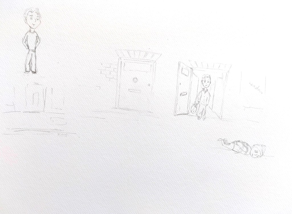 I meant to tell the story of an owl character who would be the bad guy and the bird drawn on the wall on the left hand side of the sketch would be some super hero. However, I noticed that lately I had often chosen birds as a subject for illustrations, so I took another direction and decided to draw people.