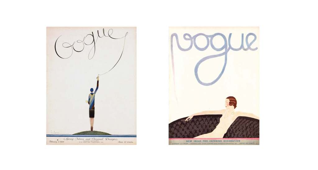 The text can be part of the illustration as demonstrated in the examples below. On the first magazine cover, the woman is writing the name of the magazine and in the second example, the smoke takes the shape of “Vogue”. These classic covers illustrated by Georges Lepape and André E. Marty work particularly well as there is a simplicity and a large background that conveys an eery feeling and offers a lot of contrast.