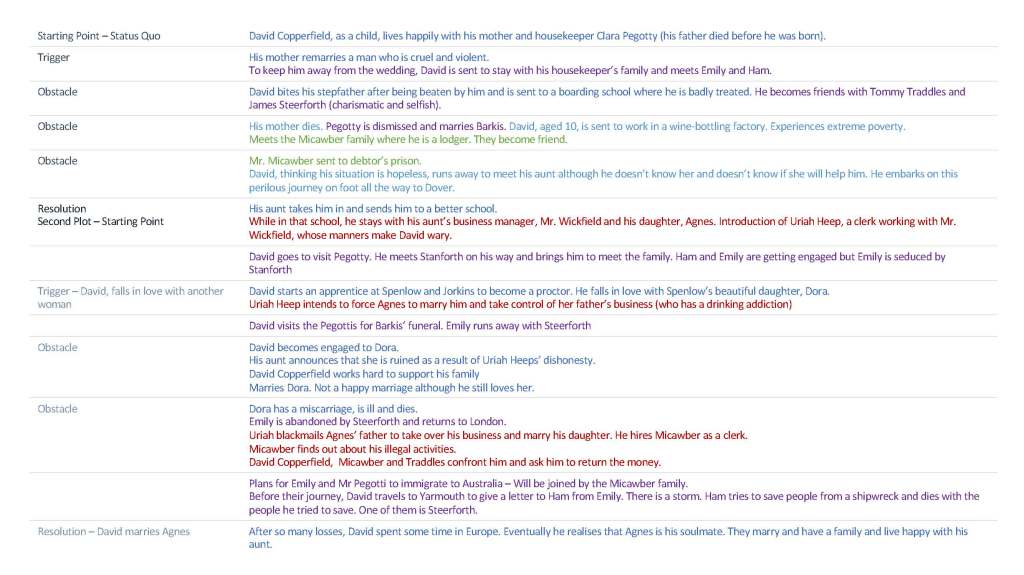 I decided to analyse the story of David Copperfield by Charles Dickens as I enjoyed that novel and it contains many elements. I checked the details of the story online to be reminded of all the events in the right order (https://www.britannica.com/topic/David-Copperfield-novel) and created a table to visualise the plot(s):