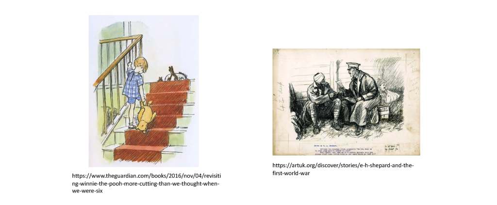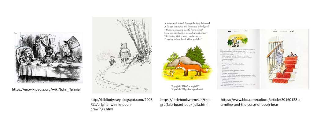Alice in Wonderland might appeal to an older audience than the Gruffalo or Winnie the Pooh and the text is longer and more complex. This is reflected in the illustrations accompanying the text. There is a simplicity in the lines in the illustrations of the Gruffalo or Winnie the Pooh whereas John Tenniel’s illustrations contain many details and are very intricate.