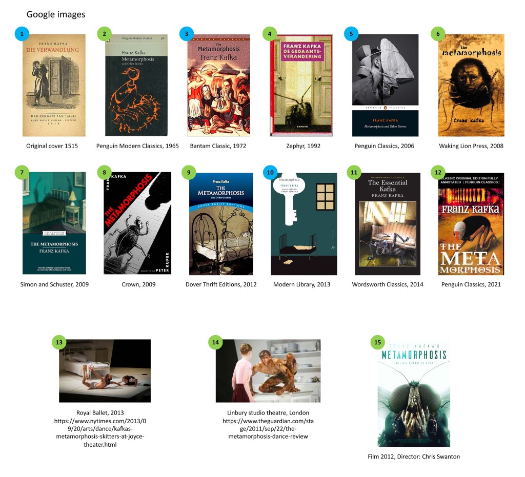 I also found an article online where the author collected as many book covers of the metamorphosis as she could find and it was very useful to be able to compare covers side by side (www.bookriot.com/metamorphosis-metamorphosis-cover-design-exploration/).