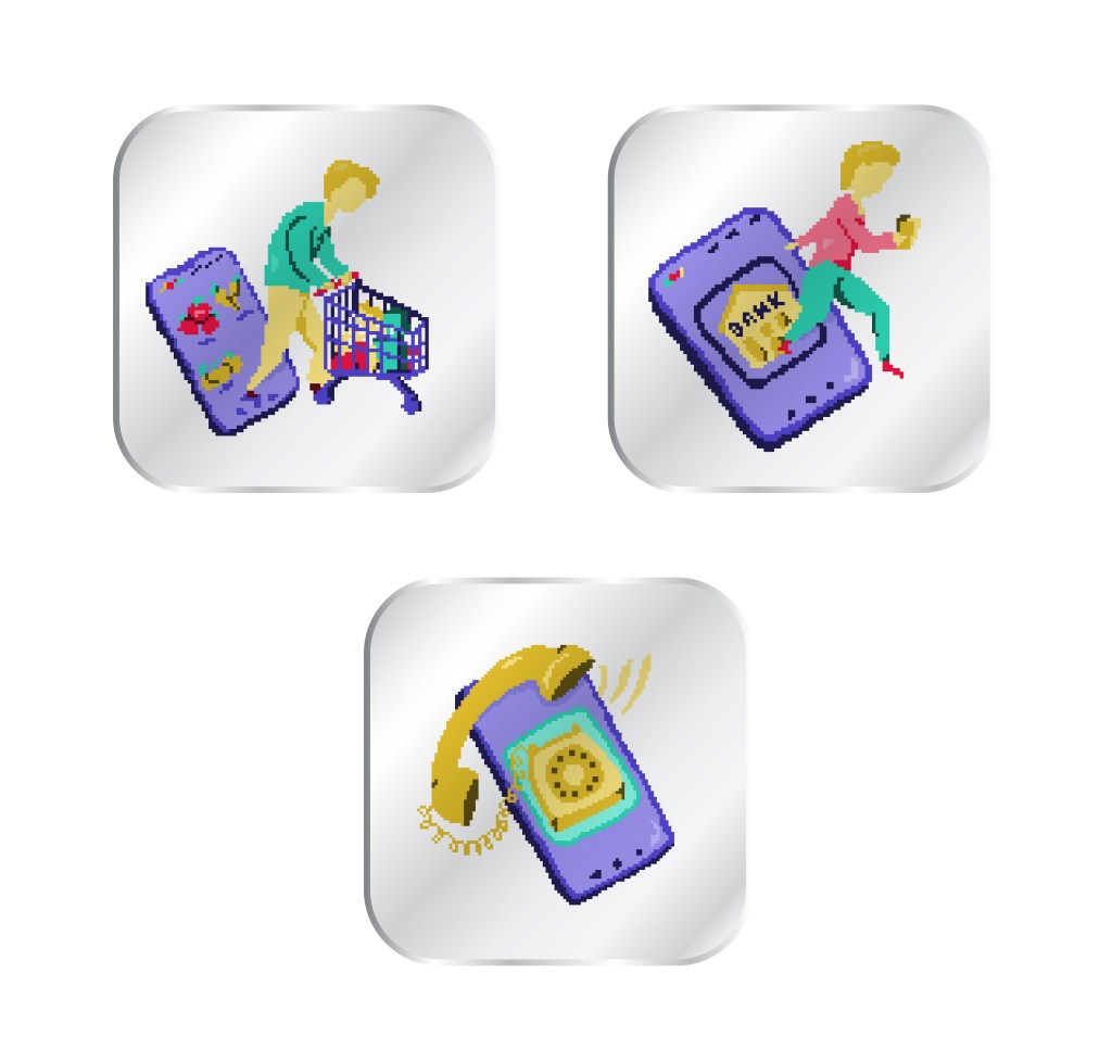 Below are the three illustrations I created; they respectively illustrate online shopping, online banking and a mobile phone that replaced a traditional phone. I tried to have a few highlights and shadows while keeping a certain simplicity so that the images could be readable. In the second one, the lady has banknotes in her hand to indicate that we now get money online but it was difficult to make that clear. I drew a phone that would be the kind of phone that was around when the first games were created to highlight the vintage aspect of the illustrations.