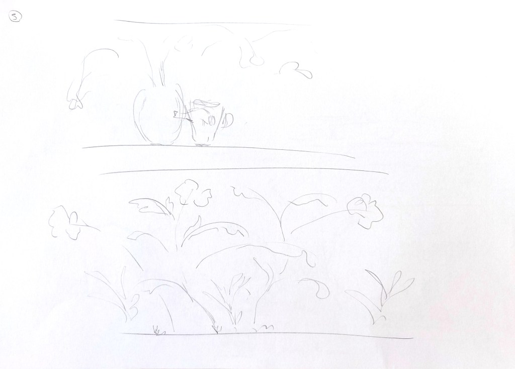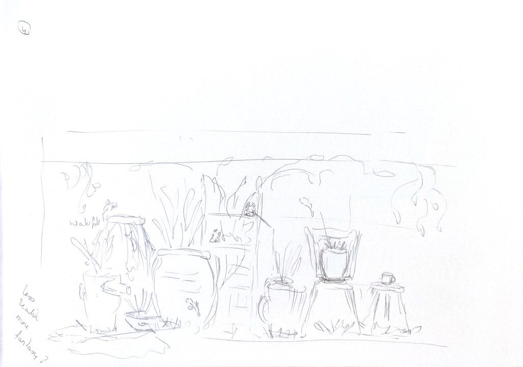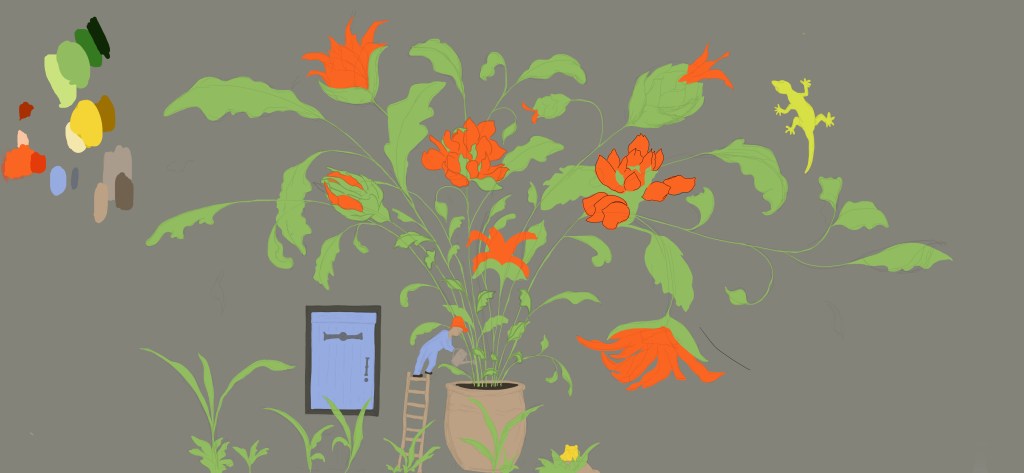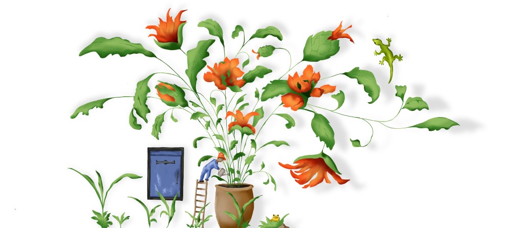 I also like the contrast between the smaller character watering the plant, the frog and this plant growing so big.