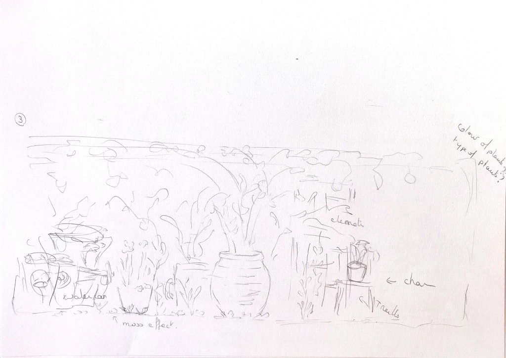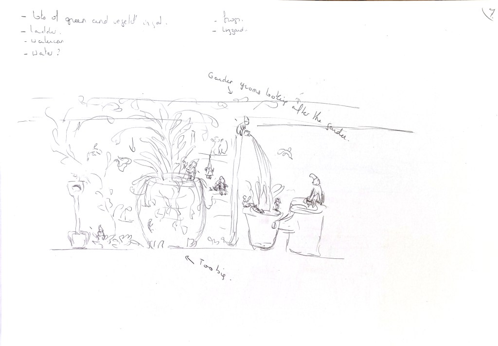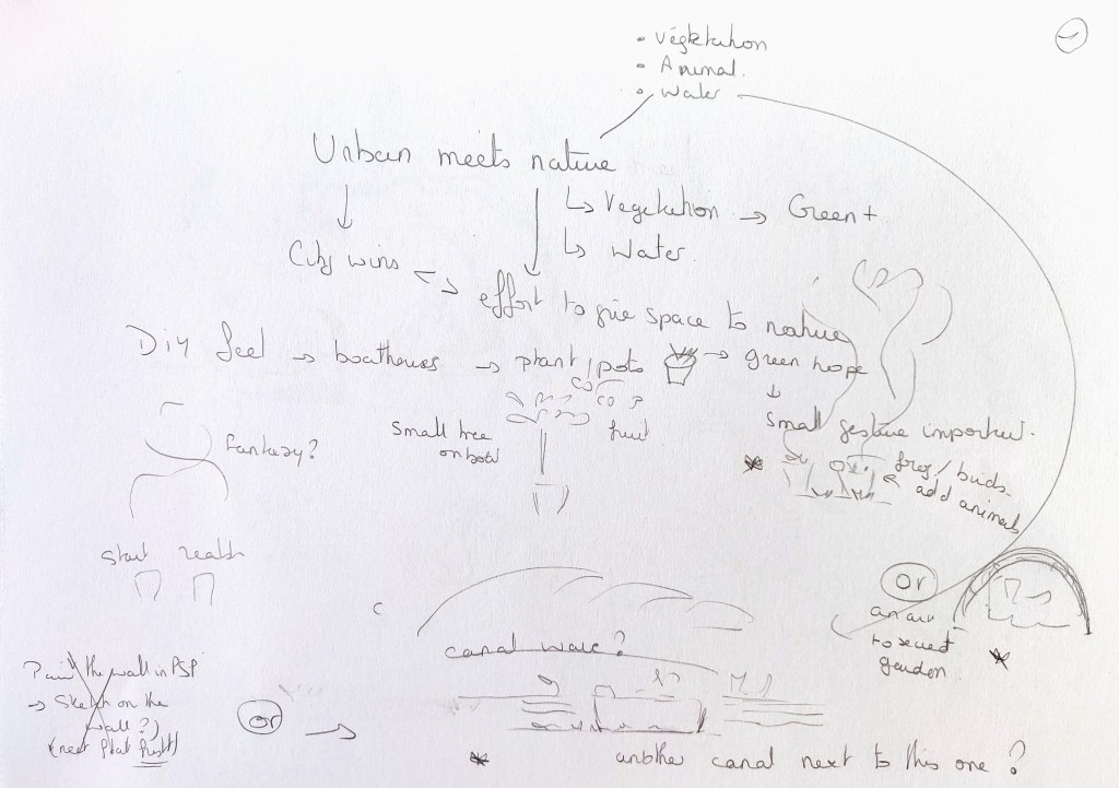 I worked on the idea of an illustration with a floral element based on some work I had done before (https://catherinerouxillustrationdegree.uk/illustration-year-2/responding-to-a-brief/coursework/part-2/exercise-a-rose-by-any-other-name/). I considered many alternatives and the idea evolved as I tried different sketches. In the end, inspired by garden gnomes, I developed a sketch where a small cartoony character waters a plant that grows out of control. It illustrates that small part of nature (the canal and parks around) surviving in urban surroundings. Beyond the wall, there is a view of Canary Wharf, offering some contrast to the area along the water.