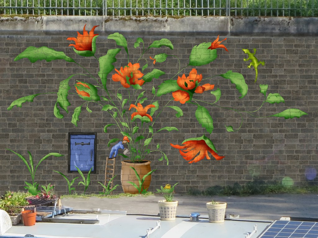 The support chosen for the illustration influences the outcome in many ways. I took into account not only the size of the wall but who would see the illustration. On the other side of the canal, a passer-by would see the piece all at once with a mixed background of buildings and trees. On the other hand, someone who would walk along that wall might notice smaller details as they walk past, such as the little frog.