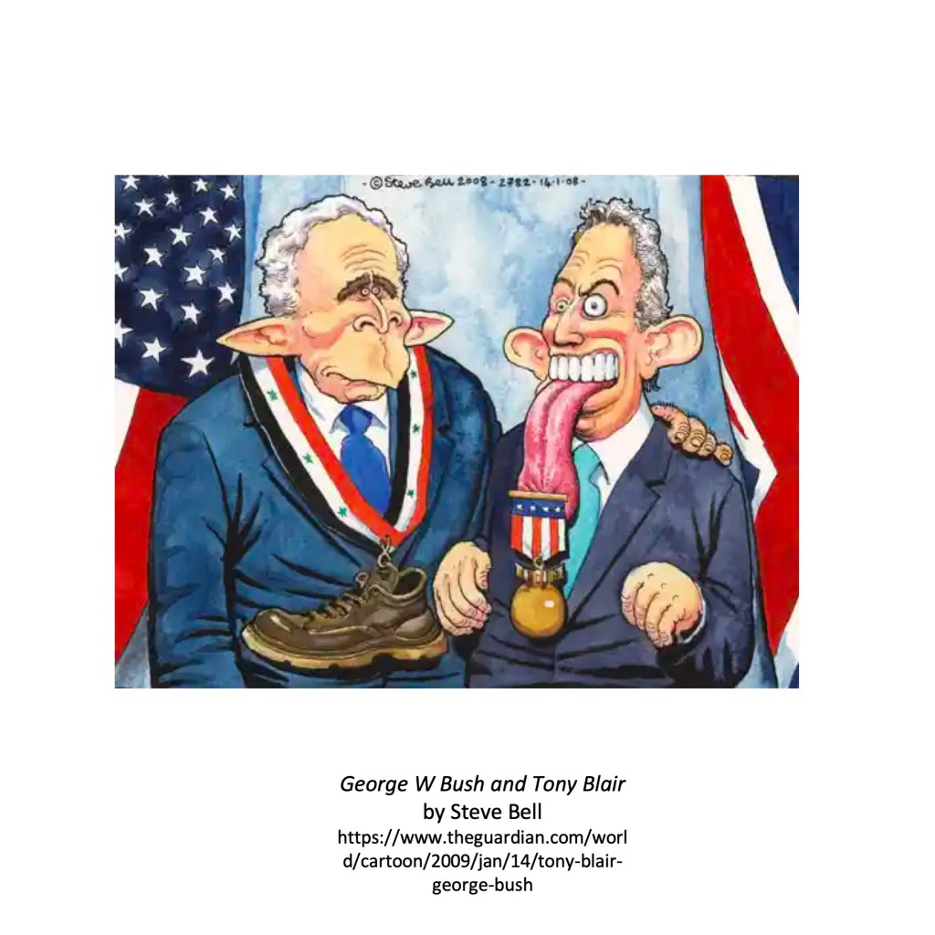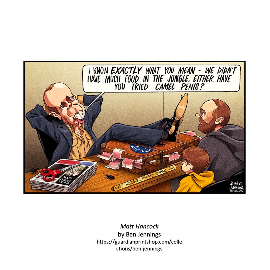 On the other hand, others are more political. This is particularly true of the caricature of Tony Blair and George Bush. Tony Blair’s entire pose (hands, tongue) indicates that he is subservient to George Bush. Matt Hancock is represented with his feet on the desk to denote a certain arrogance and this is confirmed by the dialogue.
