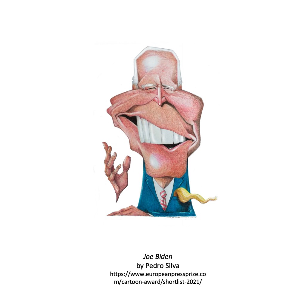 Although the caricature of Joe Biden is not so critical, his smile could be a reference to the fact that, as a politician, he is trying to seduce his audience.