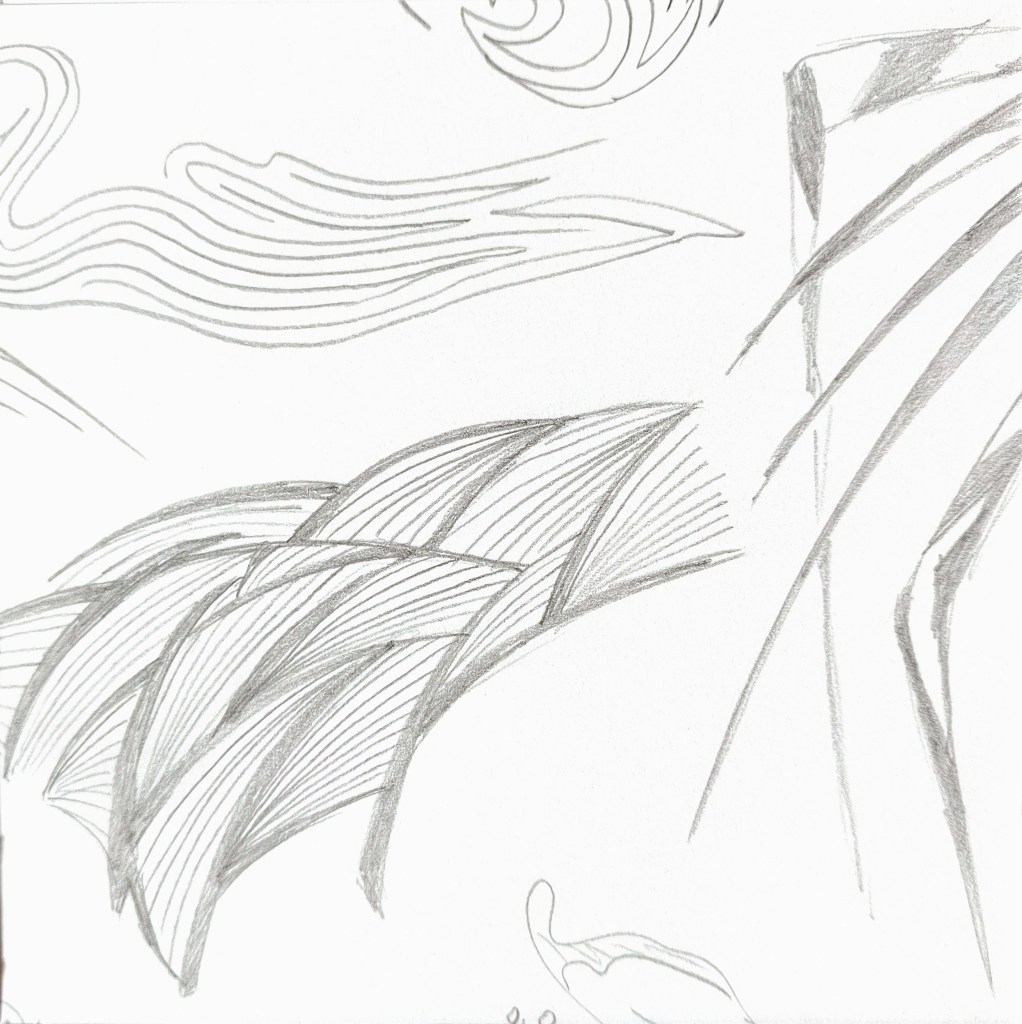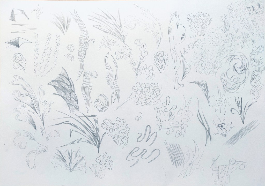 I found it difficult to keep sketching without thinking of the outcome and wondering if I should do things differently. I noticed that whenever I saw a shape that reminded me of something, I experimented to see how I could use this shape. This is the case with the segment called “Fantasy” where I started seeing a character and added eyes, ears,…And, in a sense, I had to concentrate to go back to abstract lines and stop focussing on anything in particular.