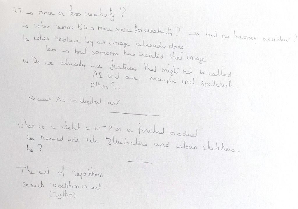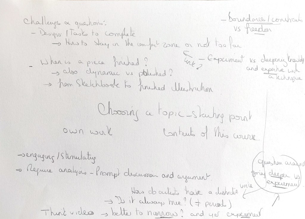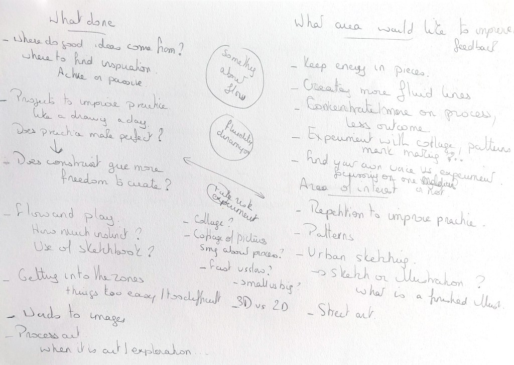 In my sketchbook, I explored areas I am interested in, challenges I sometimes encounter and questions I have about my practice.