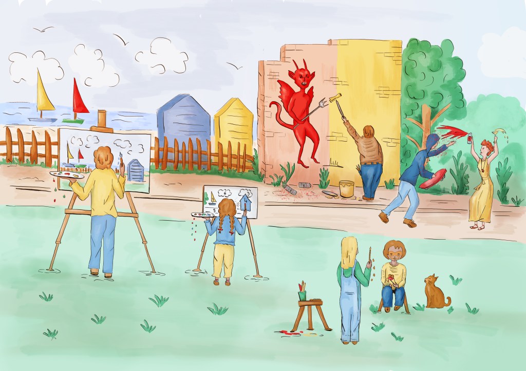 Connections: I have enjoyed making connections between different exercises or within a single one (e.g. Composing pictures). It is always interesting to see the potential when characters or sketches are assembled to create a different story. Making connections between several techniques can also bring surprising outcomes. This is what I did in the last image I created for Assignment 5. I used different techniques inspired from continuous drawing or automatic drawing to create the sketches and was happy with the dynamic of the final image. I will carry on making connections as suggested in my tutor’s feedback.