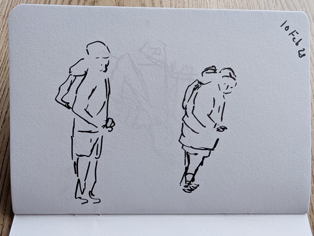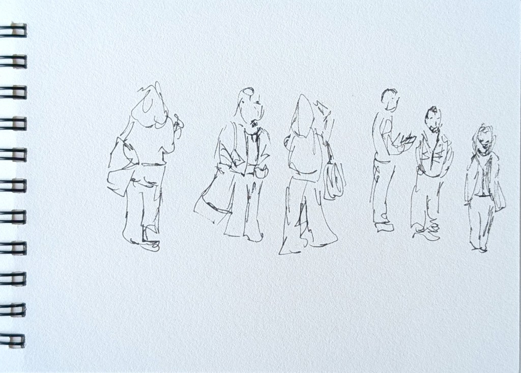 I have taken advantage of my journey to and from work to draw. However, at some point, I felt that the exercise had become a bit repetitive. On the other hand, because people keep moving, it has encouraged me to capture a pose in a few lines.