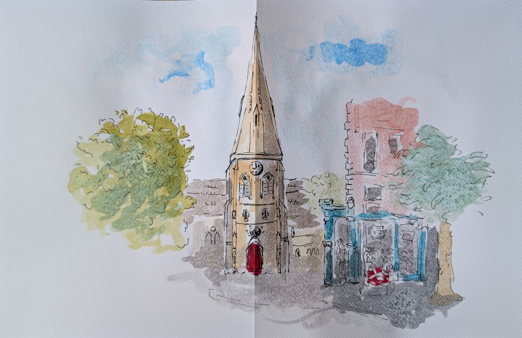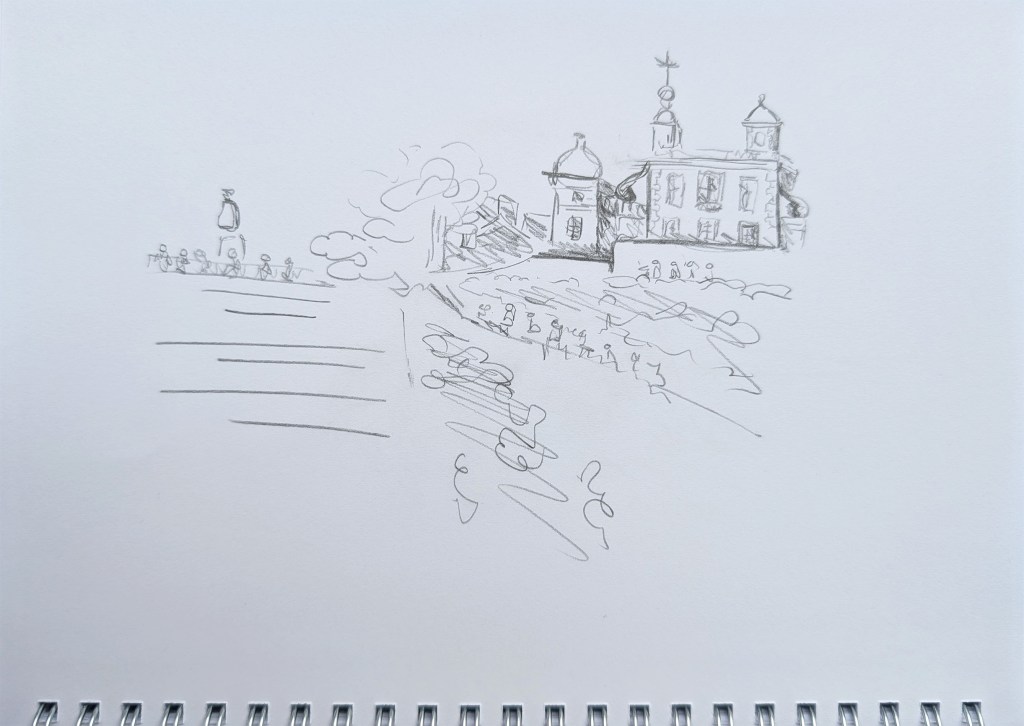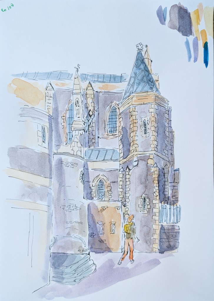 I am currently reading a book “The Urban Sketcher: Techniques for seeing and drawing on location” (Marc Taro Holmes (2014). The Urban Sketcher. Penguin.). I chose this book because it contains suggestions and exercises that could help me with difficulties I have identified, particularly adding contrast to my drawings and applying colour with watercolour. One of the exercises consists in drawing only dark shadows to create a sketch with sharp contrast. I have tried this technique a few times already. I still overcomplicate the drawings and do not only include dark shadows, but I intend to carry on with this experiment as I can see how I could improve with this exercise.