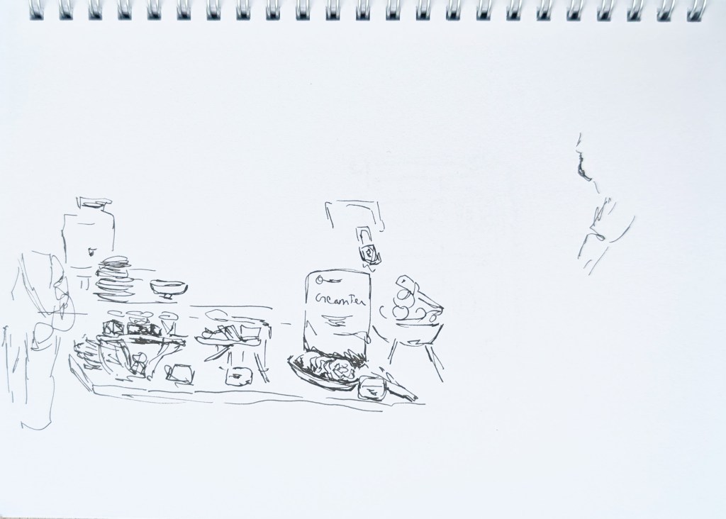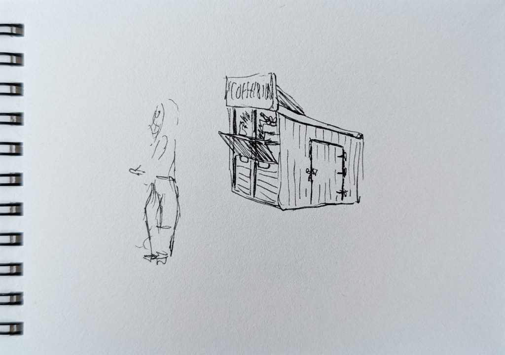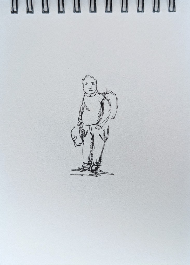 I have had to buy new sketchbooks to use when I commute as I ran out of A6 sketchbooks. There are somehow more pleasant to use (thicker paper) and, as a result, I feel more motivated to draw. I have also started using a different pen. I often used a thick felt pen for the commute that was different from my favourite ones (0.2 or 0.3 thickness). It first happened by accident because this is the pen I had in my bag, and I wanted to stick to it for a while to see what happened. In a sense, a bold pen might help me to focus less on details and be more free but I have realised that I do not enjoy it so much.