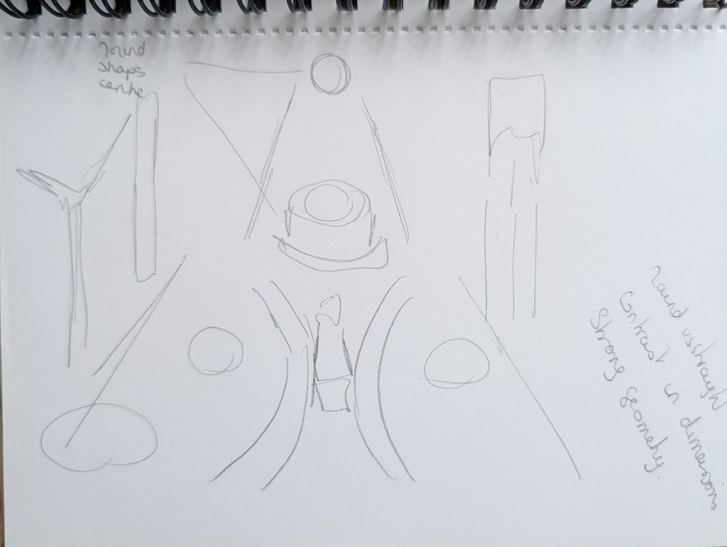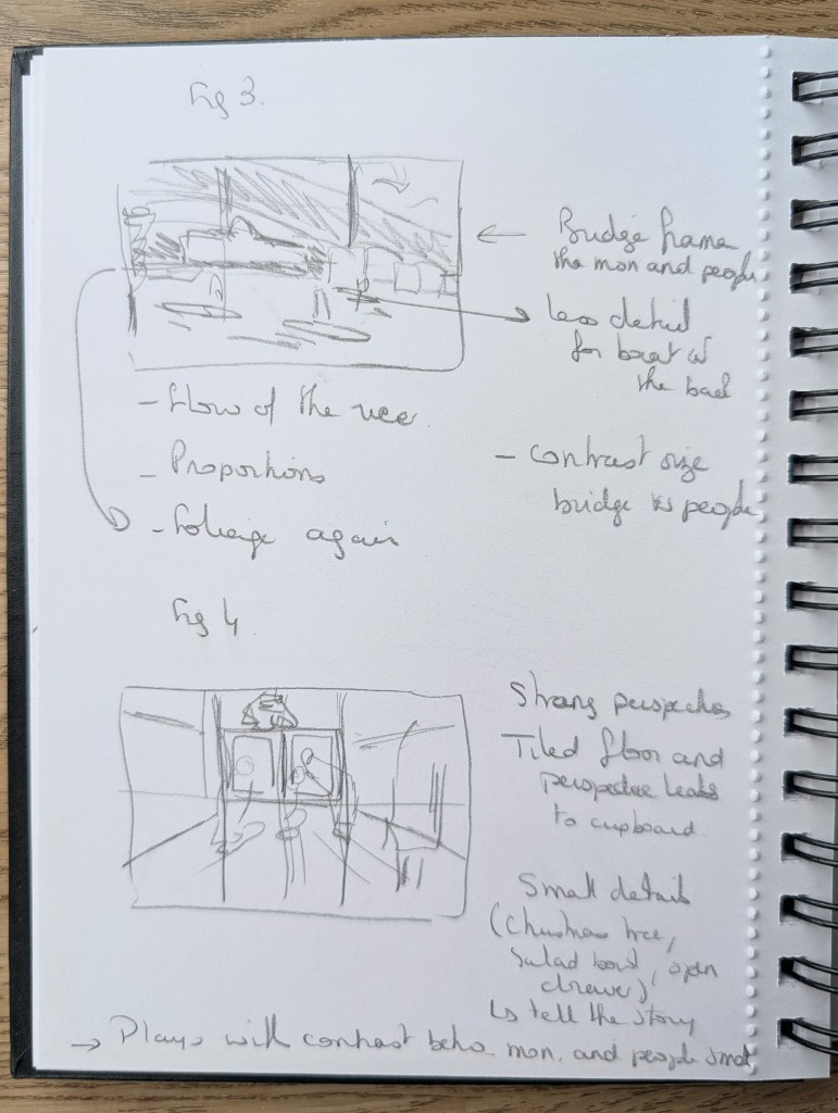 It was very interesting to analyse the big shapes and perspectives in my sketchbook to get a better understanding of the structure of the drawing. Perspective is used in a very clever way to add a sense of depth as are the many levels with stairs going up and down.