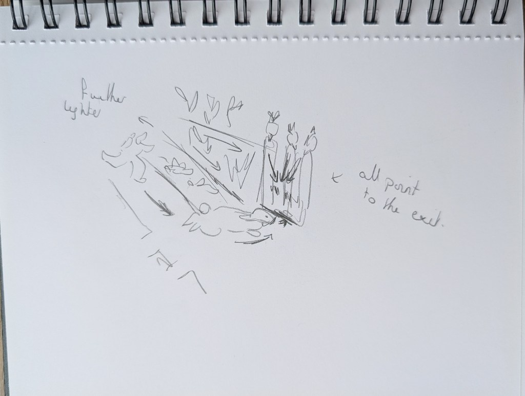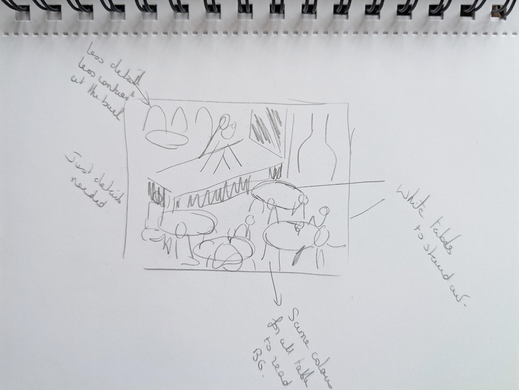 All the illustrations have been drawn at eye level and it would have been interesting to choose a different angle. In retrospect, I would have like to draw part of a room to see which details could create the right mood. I still struggle to create scenes from imagination. It might be a good idea to use a photo as a starting point and change some elements.