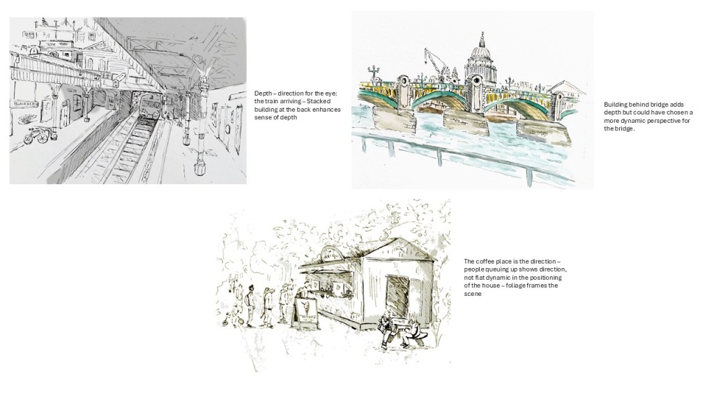 I can see better what worked in the three sketches above and how I have created depth without always being aware of the techniques employed.