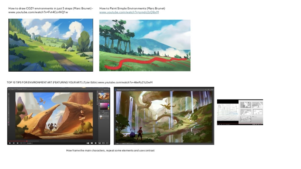 For that part of the research, I essentially watched a lot of YouTube videos as I found some incredibly useful tutorials. A lot of artists who talk about backgrounds on YouTube come from the gaming industry, probably because creating an environment that tells the right story and evokes the right mood is essential in that industry.