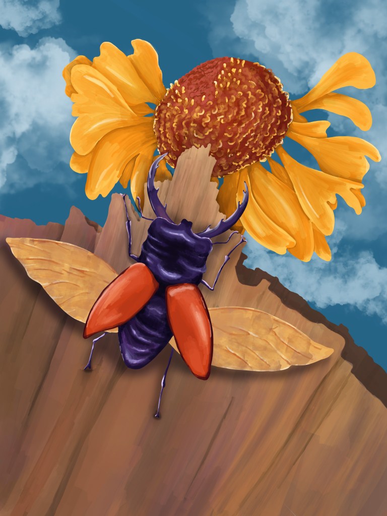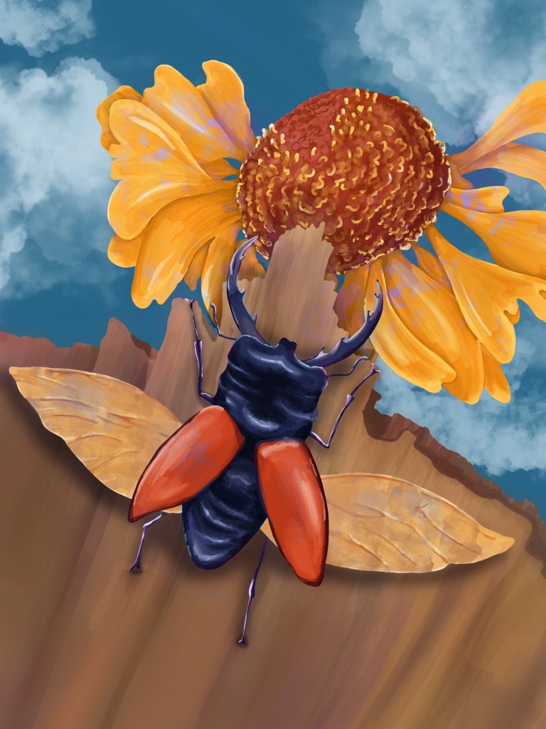 I came to the conclusion that it would be beneficial to create illustrations with a different focus. I liked the idea of creating an illustration centred on a main character where the background would matter but would be more secondary. I enjoyed painting the bug as part of my experimentation with digital painting techniques and wondered how I could have used a similar close-up as part of an illustration. I also wanted to keep exploring with colours and digital painting.