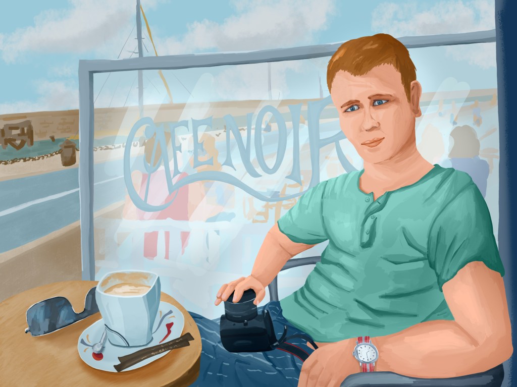 I was not interested in painting a portrait of the person in the picture and only used the photograph as a very loose reference, but I liked the posture and thought that it could tell a story of someone on holiday in a French cafe by the ocean. The place where the picture was taken is in Noirmoutier, so the name of the cafe “Café Noir” refers to the island and could be relevant to the story.
