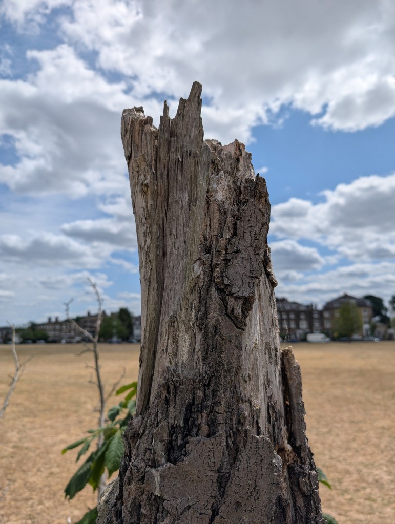 I wondered how I could create a background with some depth that would also be interesting. At first, I considered having some foliage. I went for a walk in search of inspiration, and, after a while, I saw a broken tree trunk that seemed perfect for a background. I decided to add a vibrant flower to add colour to the illustration.