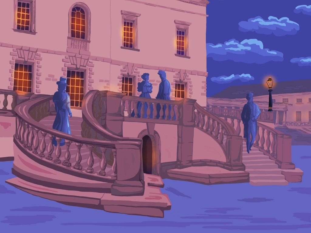 I had done some tests with that illustration before, where I added sketches of people in period costumes in Photoshop as a quick mock up. This time, I drew these characters in Procreate and recoloured the illustration with layers in Photoshop. I opted for a moody atmosphere to illustrate the fact that this is about people who might have been using this staircase in the past. It is not very clear whether these people are real people, who are outside the building at night, or if they are an evocation of the past.