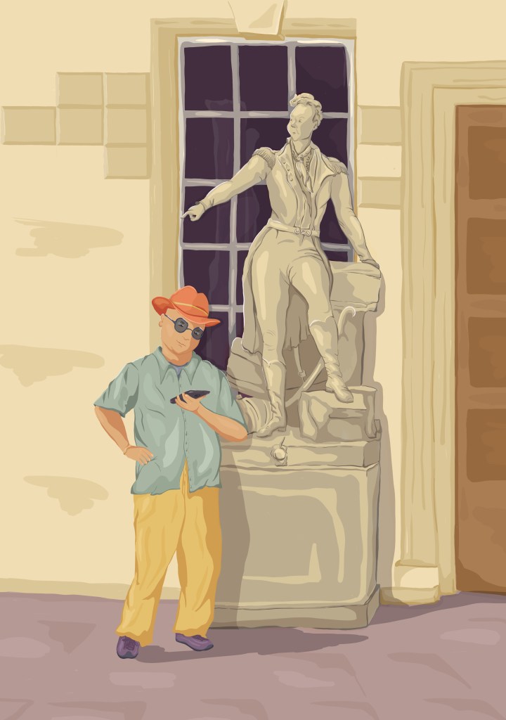 I decided to use the second image to create a digital illustration. I took elements from several pictures for this composition and positioned the man in front of the statue, so that it looks as if the statue is pointing at him. In the digital version, I changed the pose, so that the man is looking at his phone. The idea is that nowadays, we can sometimes be unaware of the present moment and our surroundings because of digital media. Moreover, the way we look at the past is often mentioned in the news, and in this image the past interacts with the present.