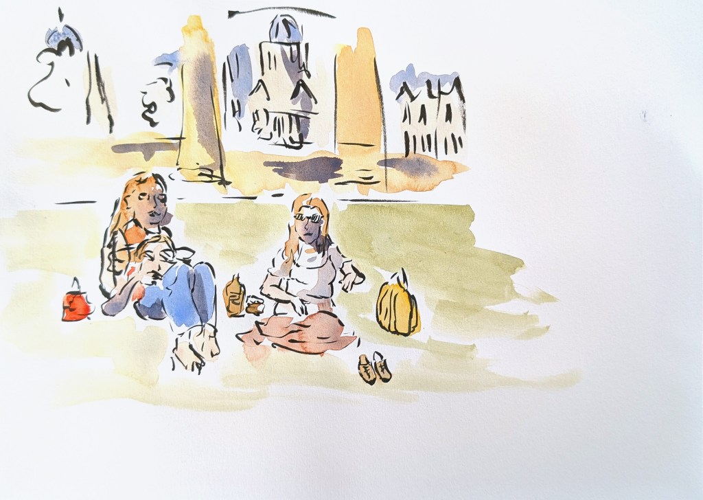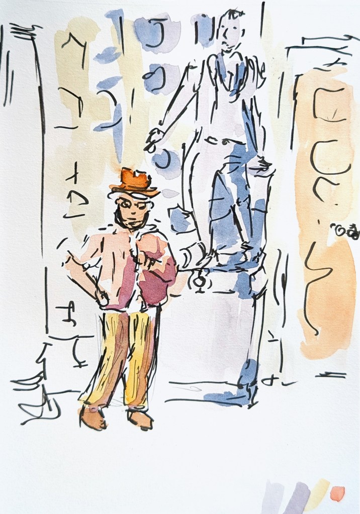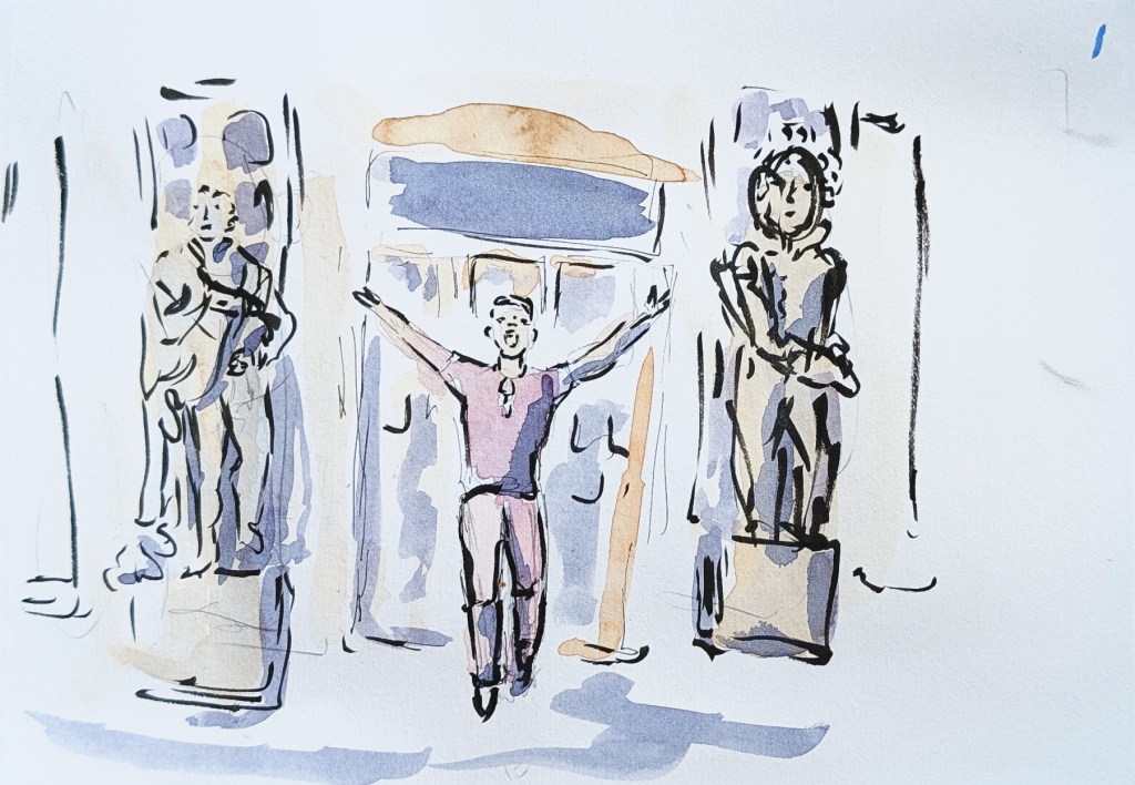 It helped to create a sketch with watercolour beforehand. Every time I paid too much attention to accuracy, I looked at the sketch to remember that it was more important to draw dynamic lines. The initial sketch also showed that, in that case, the background is only there to give some context, but it is not so important. I therefore tried not to include too many details. I have used the window to frame the statue.