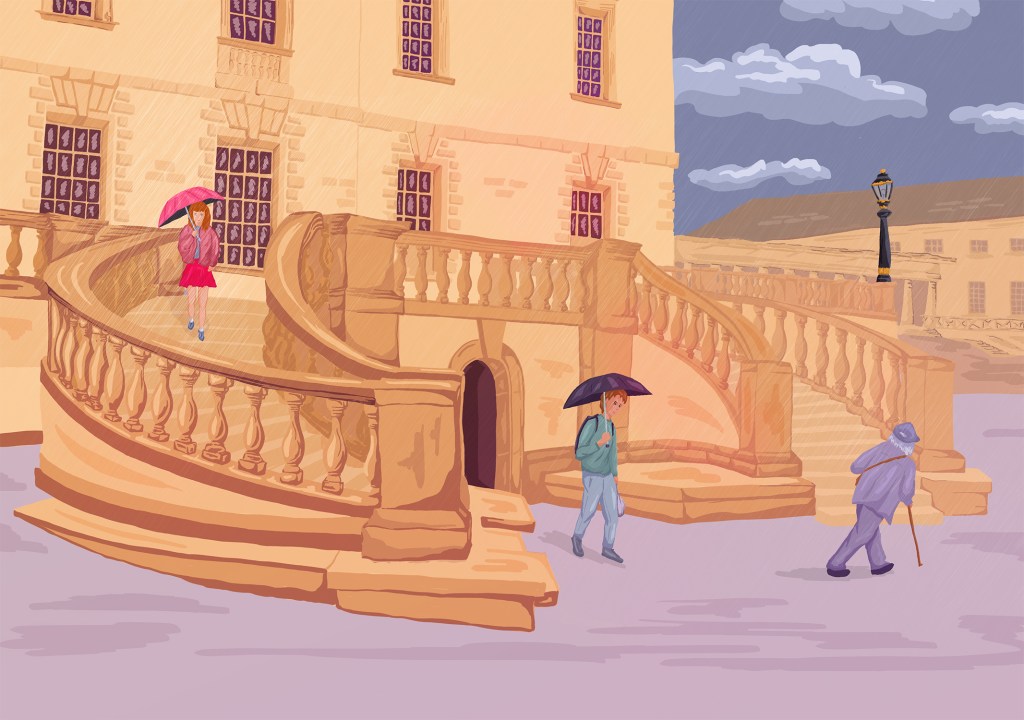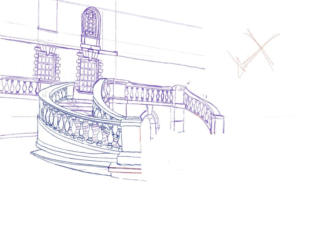 I had decided to create a vector with flat colours. However, inspired by the research I had been carrying out for the literature review about stylisation and artists such as Colin Elgie (https://www.illustrationx.com/artists/ColinElgie) and Paul Cox (https://chrisbeetles.com/artist/34/paul-cox), I realised that what I kept trying to achieve was more fluidity. I chose the staircase because of all the rounded shapes and movement in the structure and I wanted to highlight that aspect.