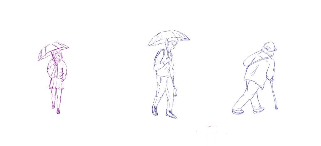I am not happy with the way I drew and rendered the girl with the umbrella. I tried to colour the character twice but it does not really work, partly because the initial sketch is too static, partly because I was trying to add too many details even though the character is very small.