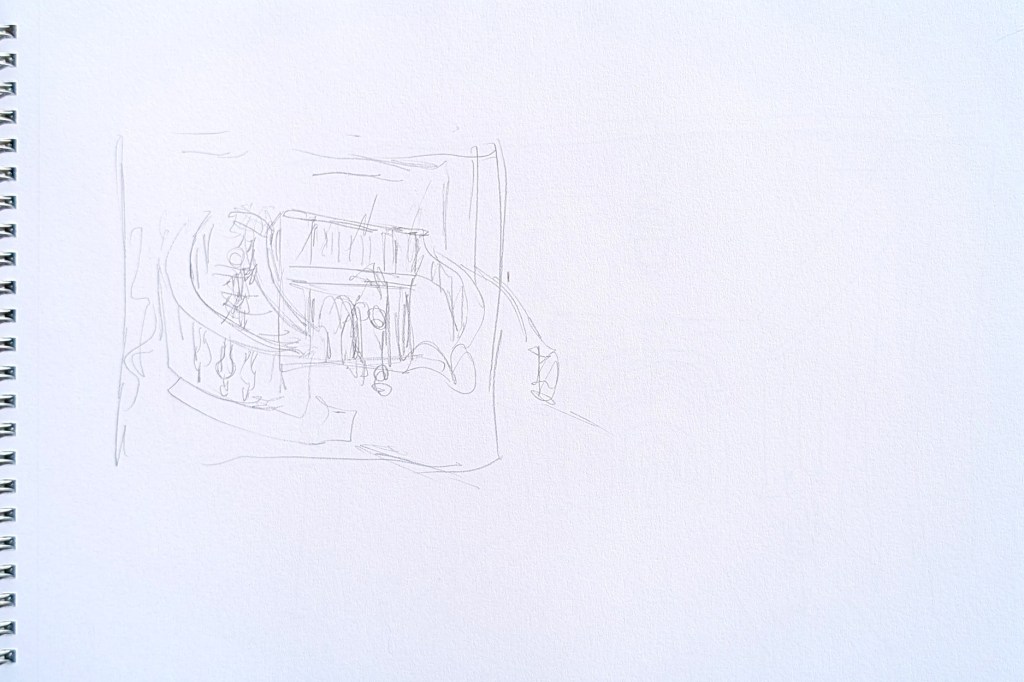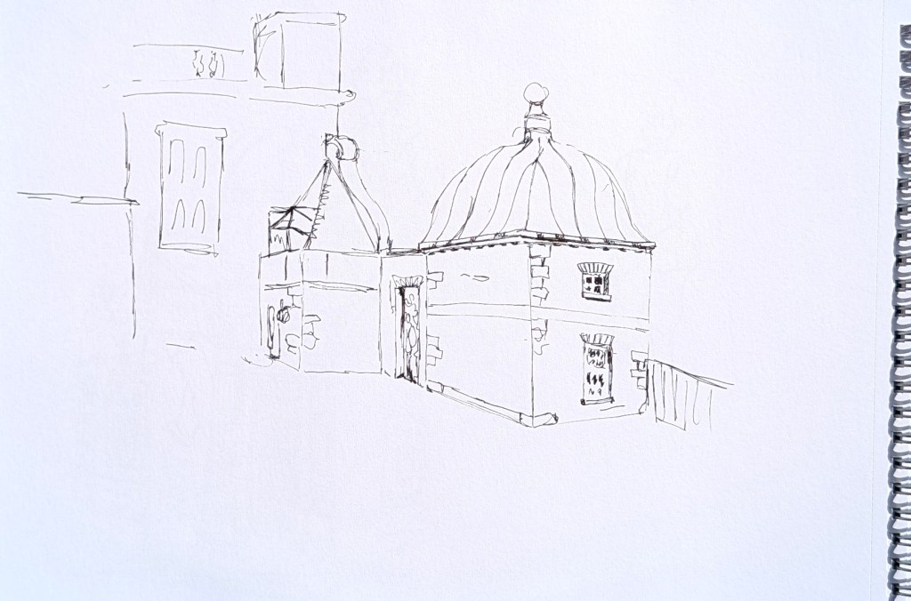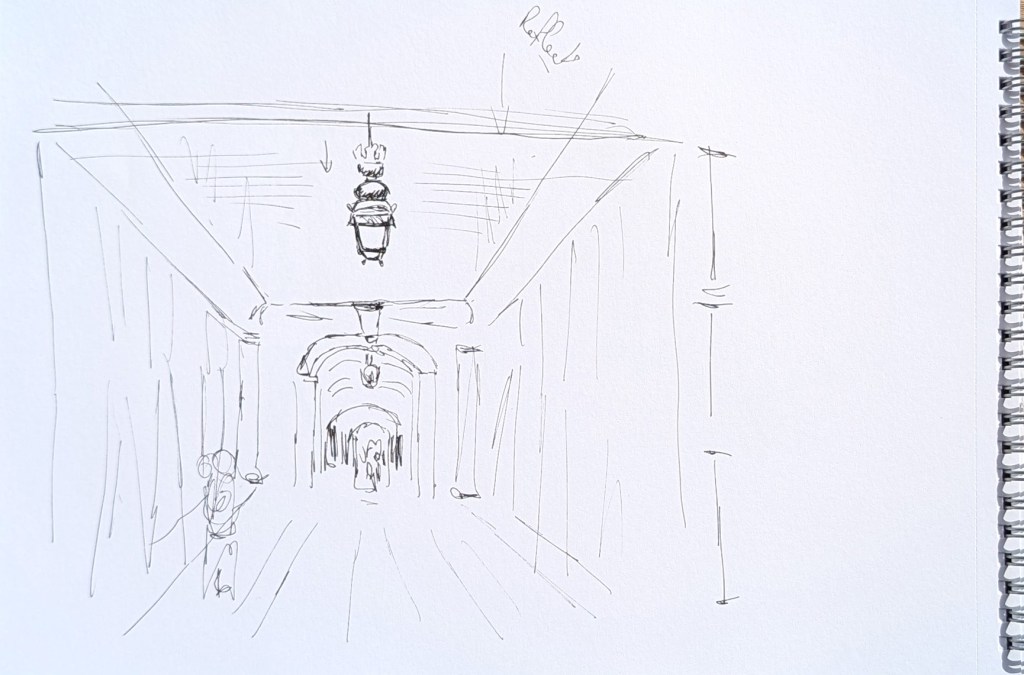 After creating some thumbnails, I started to work on Illustration #1. The perspective in this drawing is quite difficult to render accurately with the rounded stairs. However, I have realised how much I enjoy drawing complex buildings with interesting perspectives and patterns, and I think that it is worth spending a bit more time to capture the curves of the architecture. I wanted to make sure that the proportions were right before adding characters.