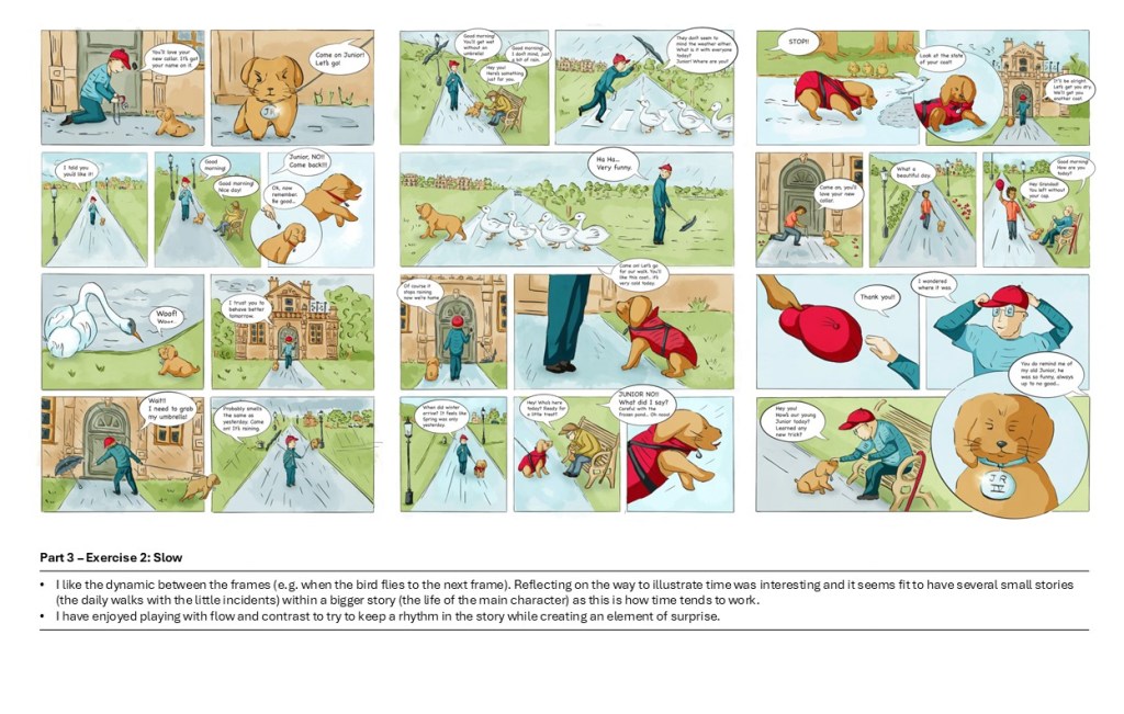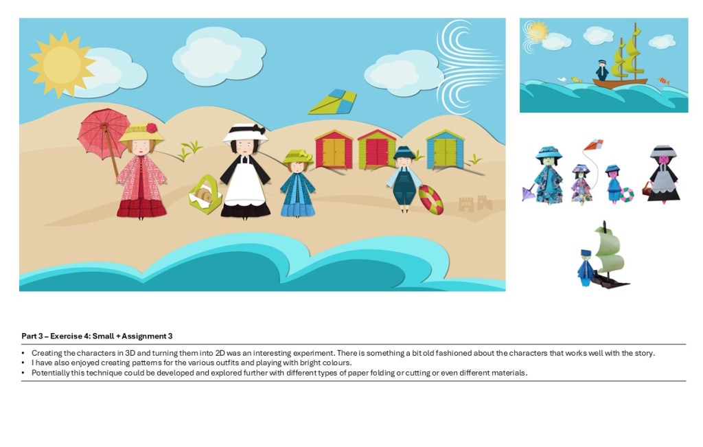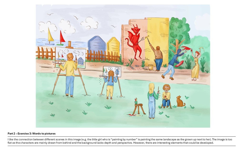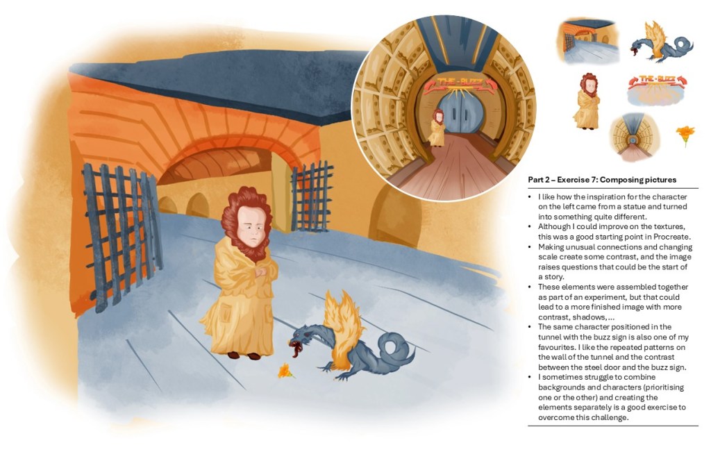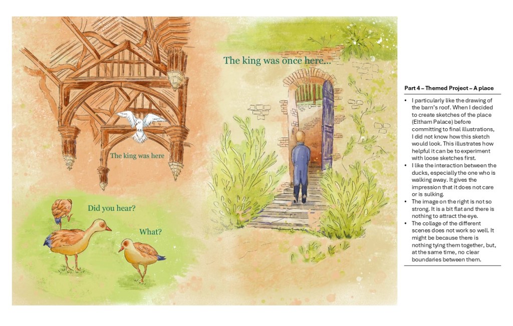 I looked at all my work and notes as well as my tutor’s feedback. I put my illustrations and sketches side by side and added comments to have an overview on what I had achieved, things I would have done differently and aspects I would like to improve.