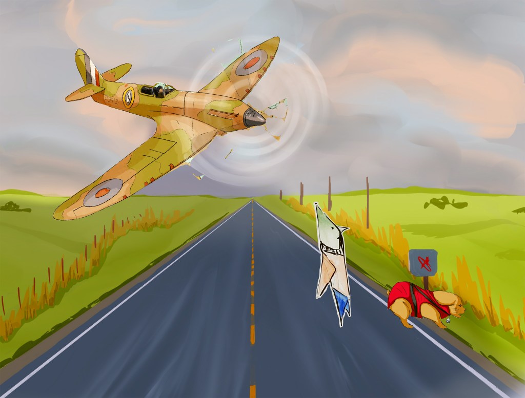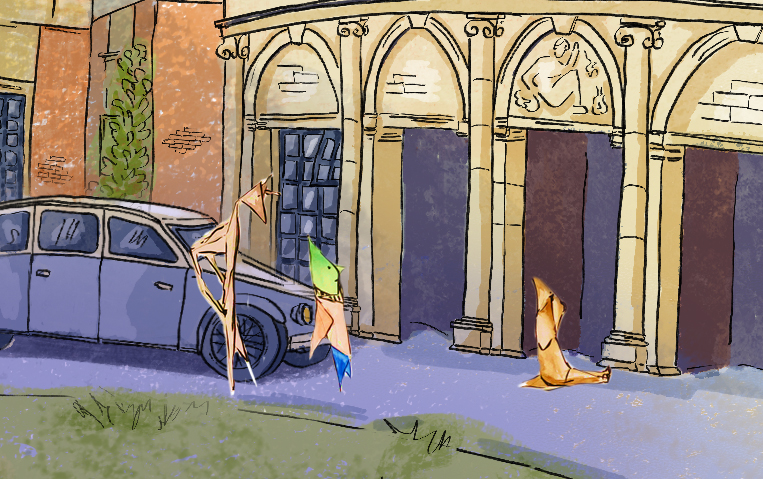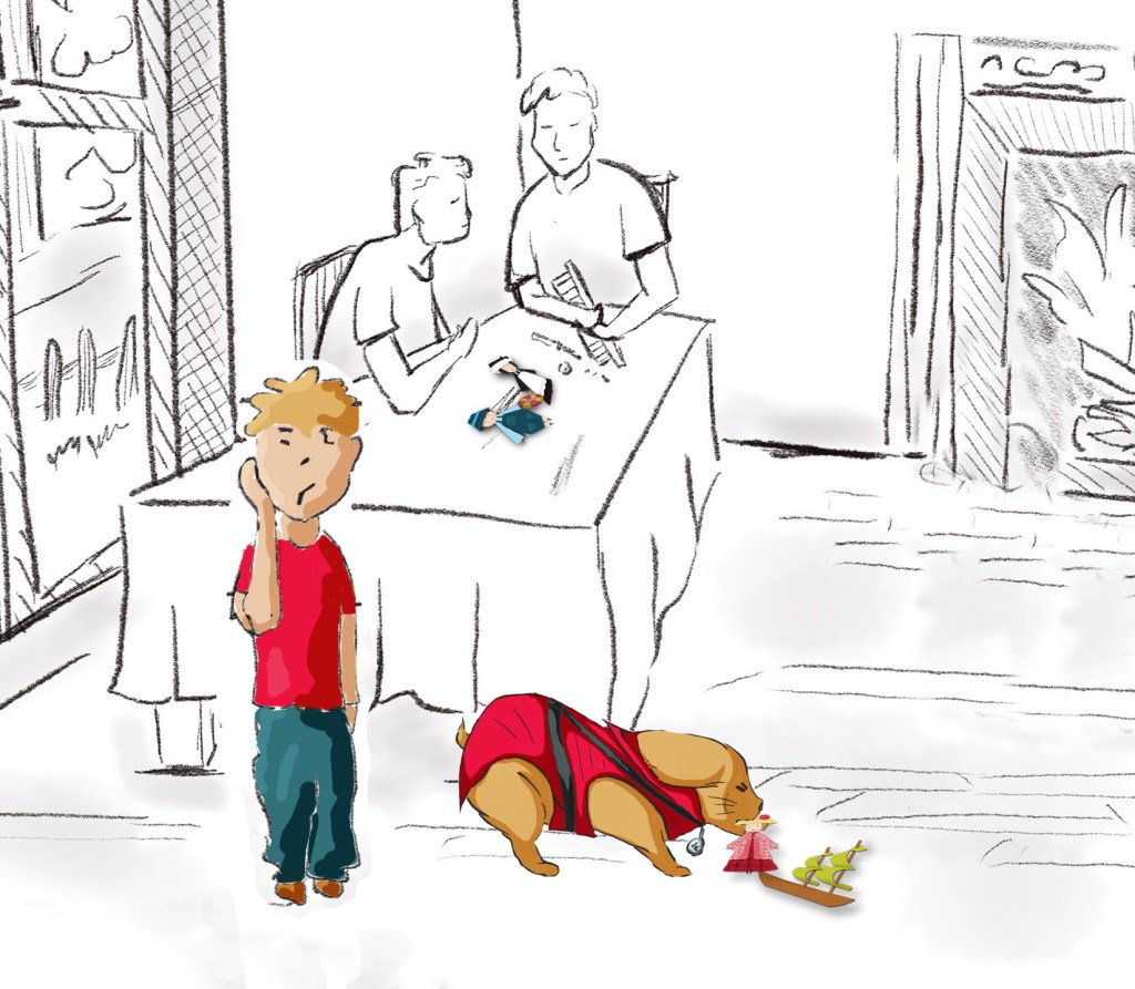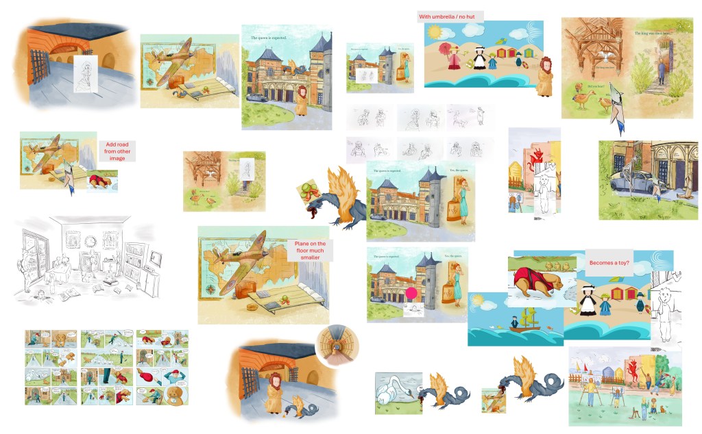 The last two composite images are more about experimenting with new ways of creating collages with the different scenes whereas the others are about telling new stories. In image #03, I used the fact that some of the characters are meant to look as if they are made out of paper and turned them into toys. Sometimes, when the characters are placed in a different context, their expressions or poses can be read differently. In image #04, the dog is running away, whereas in image #03, he is chewing the paper toys.